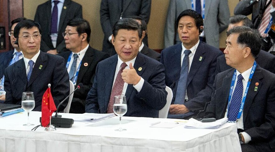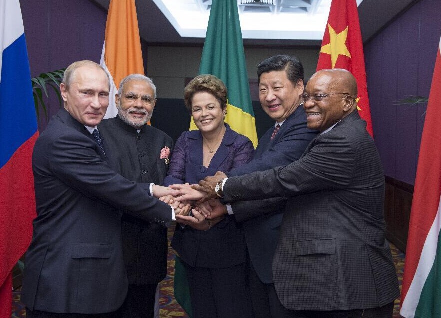 Chinese President Xi Jinping (2nd R), Brazilian President Dilma Rousseff (C), Russian President Vladimir Putin (1st L), Indian Prime Minister Narendra Modi (2nd L) and South African President Jacob Zuma pose for a group photo before a meeting of leaders of the BRICS countries in Brisbane, Australia, Nov. 15, 2014. (Xinhua/Li Xueren)