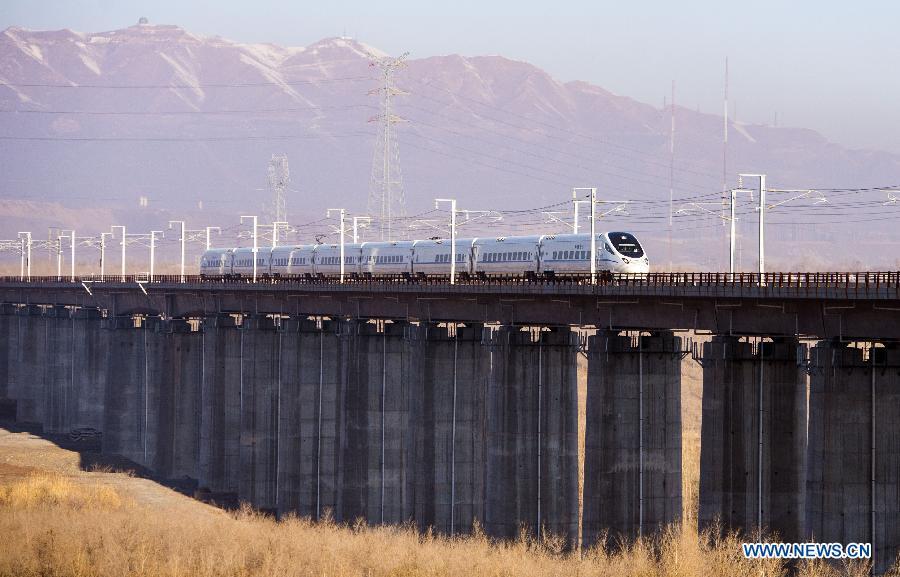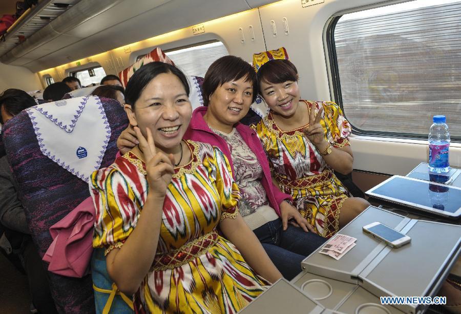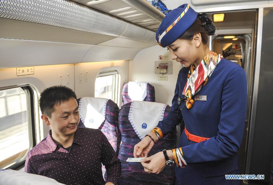 Train conductor Dai Dan examines tickets on a CRH train in Urumqi, capital of northwest China's Xinjiang Uygur Autonomous Region, Nov 16, 2014. The first high-speed rail in northwest China's Xinjiang Uygur Autonomous Region became operational on Nov 16, slashing travel time between the regional capital of Urumqi and the eastern city of Hami by half to three hours. The 530-km rail, with a designed speed of over 200 km per hour, is part of the 1,776-km Lanxin high-speed railway linking Urumqi with Lanzhou, capital of northwestern province of Gansu, which will be put into service by the end of this year. (Xinhua/Jiang Wenyao)