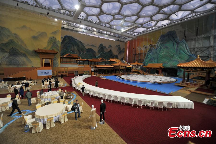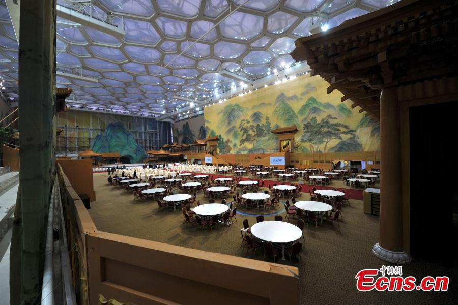 Journalists take photos in the Water Cube in Beijing on November 15, 2014. The Water Cube, also known as the National Aquatics Center will reopen to the public on November 22 after the APEC meeting. APEC leaders gathered at the Water Cube on November 10, where they took a group photo wearing traditional Chinese outfits and later attended a banquet with local delicacies from across China. The new decorations done for APEC will be preserved after it's reopened to the public. Visitors can take photos at the same place where the APEC leaders had their photo taken and have a close look at the welcome banquet and even enjoy the delicious banquet dishes. [Photo: Chinanews.com/ Jin Shuo]