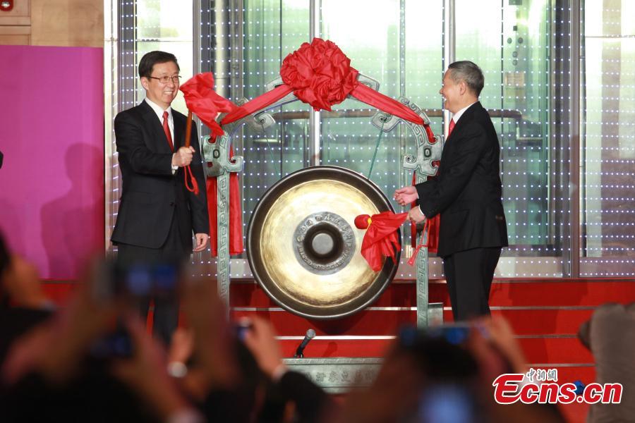 Secretary of the CPC Shanghai Municipal Committee Han Zheng (L) and Chairman of China Securities Regulatory Commission Xiao Gang hit a gong during the launch ceremony of the Shanghai-Hong Kong Stock Connect in Shanghai on November 17, 2014. The landmark stock trading link program allowing Hong Kong and Shanghai investors to buy and sell shares on each other's bourse is officially launched on Monday, marking the start of one of China's most significant moves to further open its capital markets. [Photo / Zhang Hengwei]