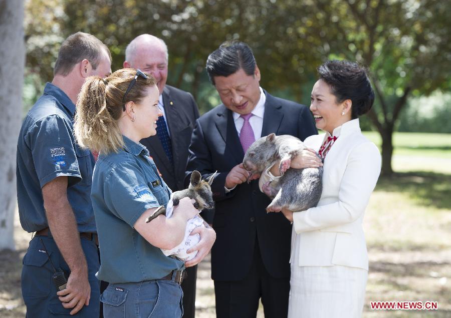 Chinese President Xi Jinping (2nd R), his wife Peng Liyuan (R), holding a wombat, and Australian Governor-General Peter Cosgrove (3rd R) share a light moment at the Government House in Canberra, capital of Australia, Nov 17, 2014. (Xinhua/Huang Jingwen)