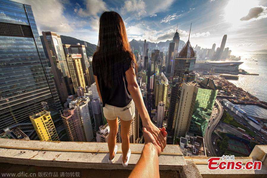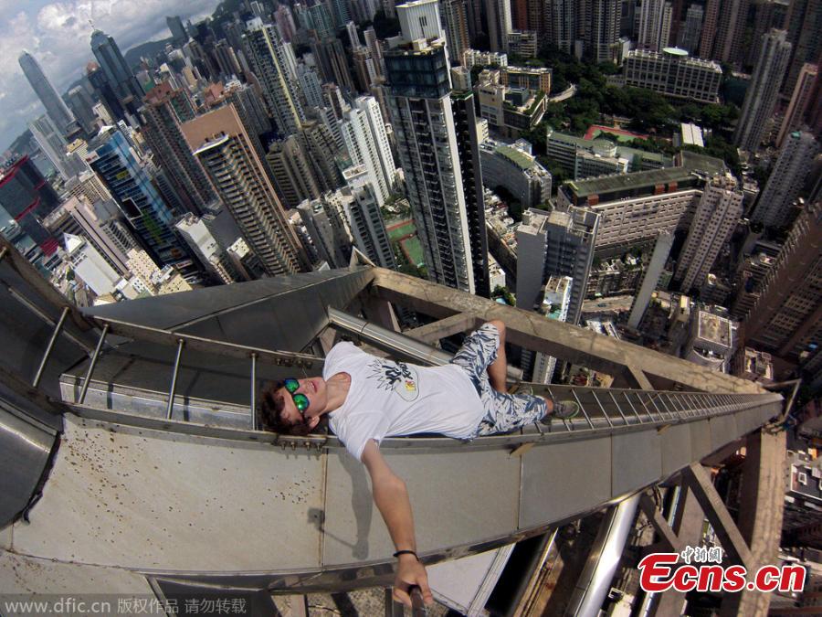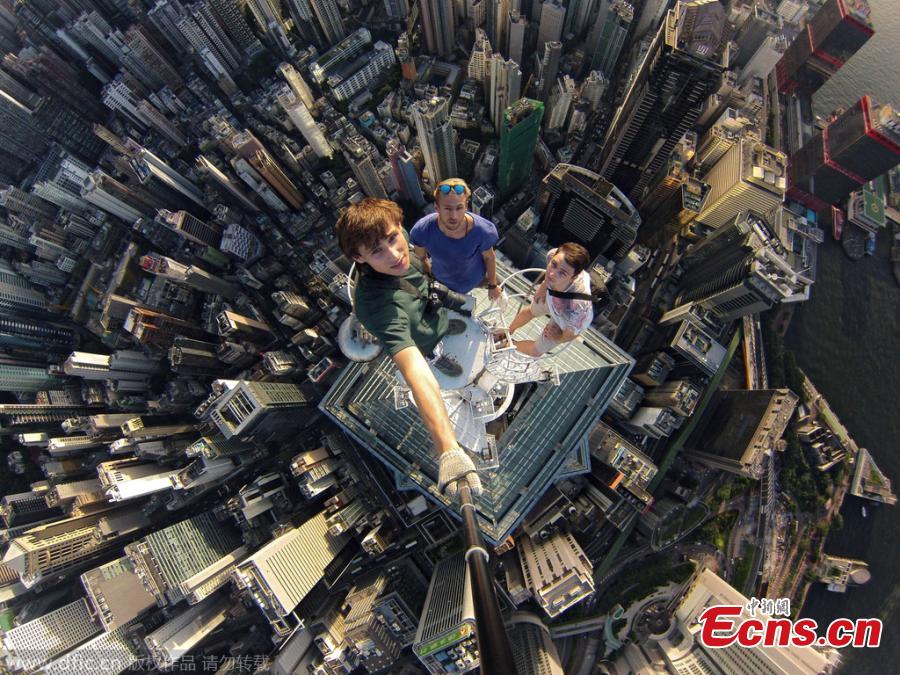 A Russian extreme sports lover takes high-altitude selfies after climbing to top of Hong Kong’s fifth tallest building “The Center” at 346 meters tall on November 17, 2014. The adventurer Alexander Remnev and his friends climbed to top of the 73-story skyscraper with no protection gears. [Photo/ IC]
