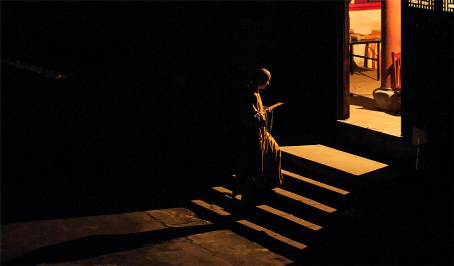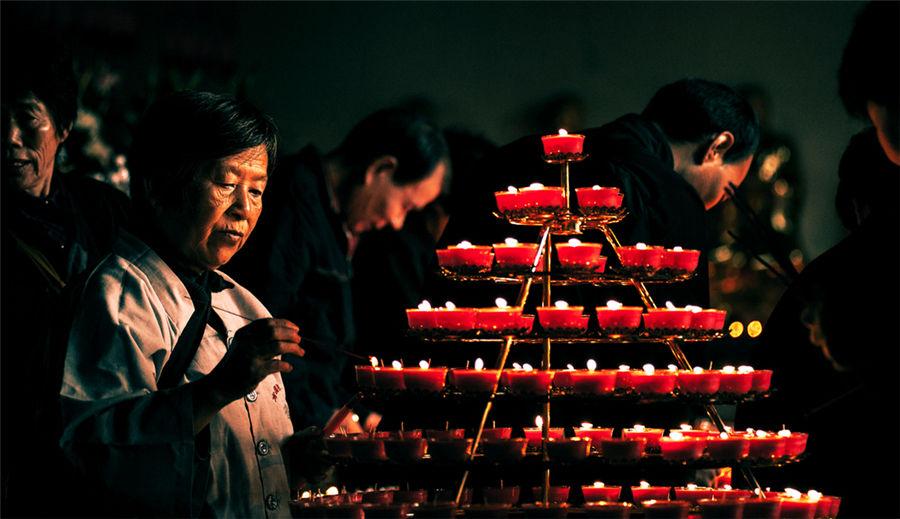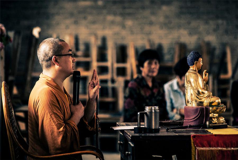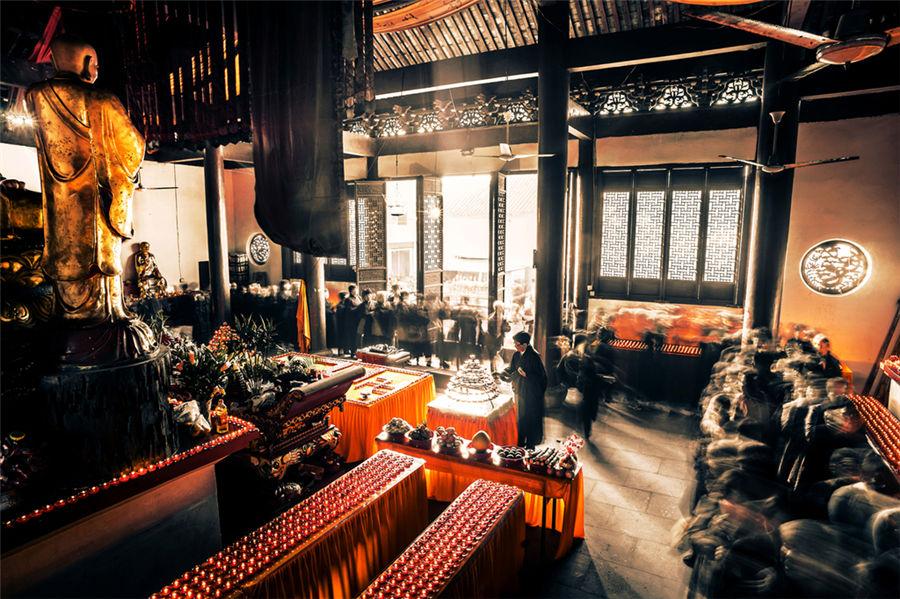 Villagers help clean the wooden gate of the main hall in Longsan Temple to prepare for the upcoming celebration of the birthday of Medicine Buddha in Longsan Temple, Ningbo in Zhejiang province, Oct 21, 2014. [Photo by Liu Zhihong/provided to chinadaily.com.cn]