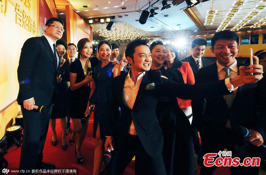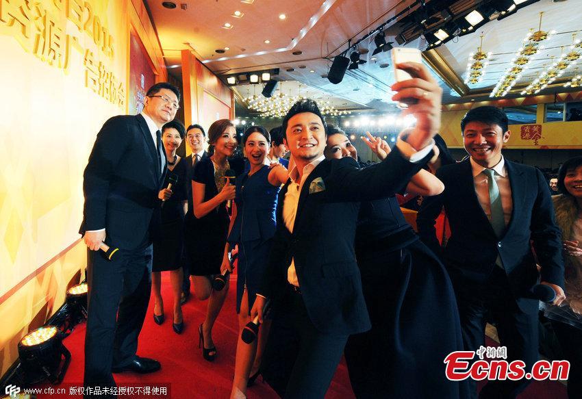 CCTV hosts pose for an Oscars-style selfie at an advertising auction in Beijing on November 18, 2014. [Photo/CFP]