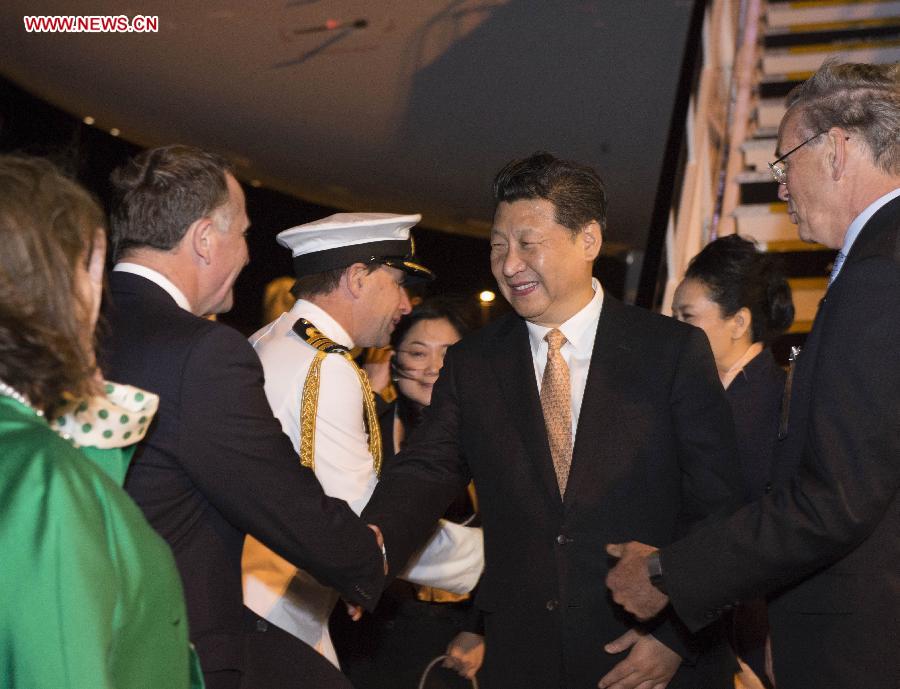 Chinese President Xi Jinping (3rd R) and his wife Peng Liyuan (2nd R) arrive at the airport of Auckland, New Zealand, on Nov 19, 2014. Xi Jinping arrived Wednesday in Auckland to start his state visit to New Zealand at the invitation of Governor-General Sir Jerry Mateparae and Prime Minister John Key. (Xinhua/Li Xueren)
