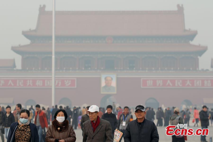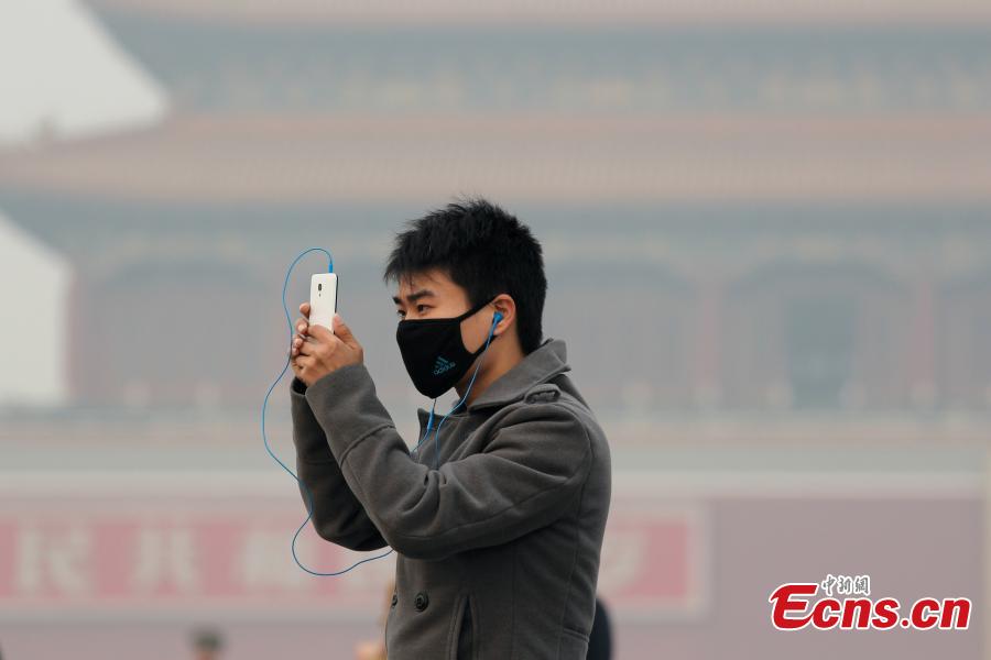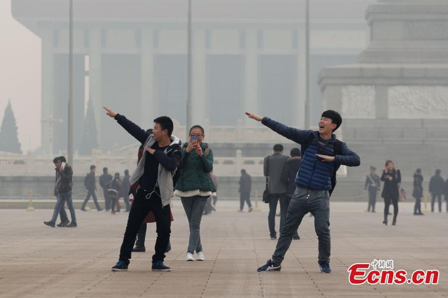 A man wearing mask poses for a photo amid heavy smog at Tian'anmen square in Beijing on Wednesday, November 19, 2014. Beijing's air quality index hit 348 at 4 pm with the index of PM2.5, the smaller but more harmful particles, also reaching the same level, said the website of the Beijing Environmental Protection Monitoring Center. [Photo: China News Service/ Song Hantao]