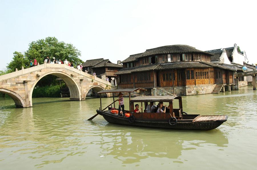 A cross-shaped river winds through the town, with all buildings along the riverbank facing the water, which presents a mesmerizing landscape. In Wuzhen, waterways act as streets, while riverbanks are markets. Boats come and go in the water with locals and tourists sitting inside chatting, while vendors up on the banks cry out what kinds of goods they have for sale. The abundance of local resources has led to the town being dubbed "the town of rice, fish and silk".