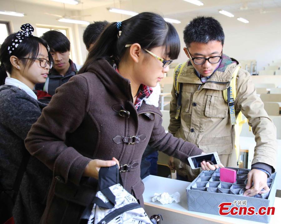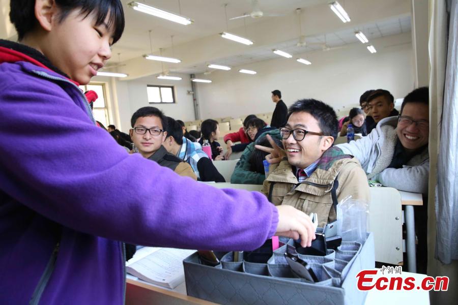 Students place their cell phones into a box before class according to a new school rule of Zhejiang A & F University in Hangzhou, Zhejiang province on Thursday, November 20, 2014. The campaign designed to help students get rid of their smart phone addiction was welcomed by both teachers and students. [Photo: China News Service/ Chen Shengwei]