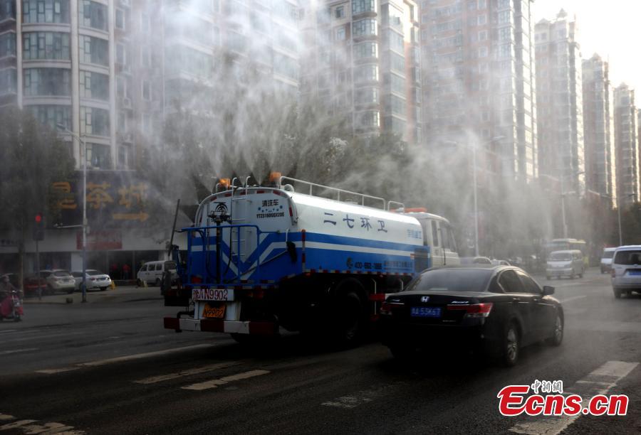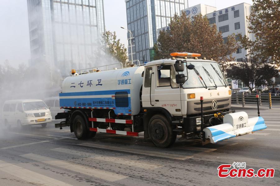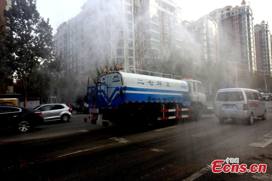 New-type street sprinkler help combat smog in Zhengzhou(1/3)