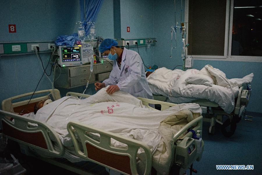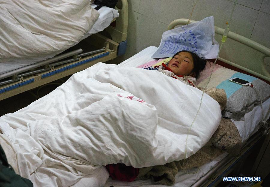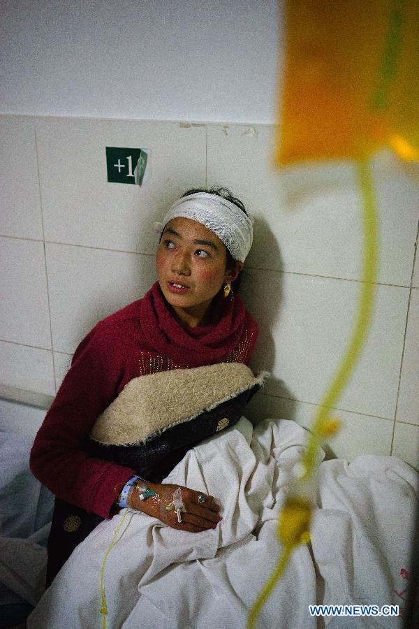 A pupil receives medical treatment in hospital in Kangding County, Ganzi Tibetan Autonomous Prefecture in southwest China's Sichuan Province, Nov. 23, 2014. Two people were killed after a 6.3 magnitude earthquake struck Kangding on Saturday afternoon. (Xinhua/Li Qiaoqiao)