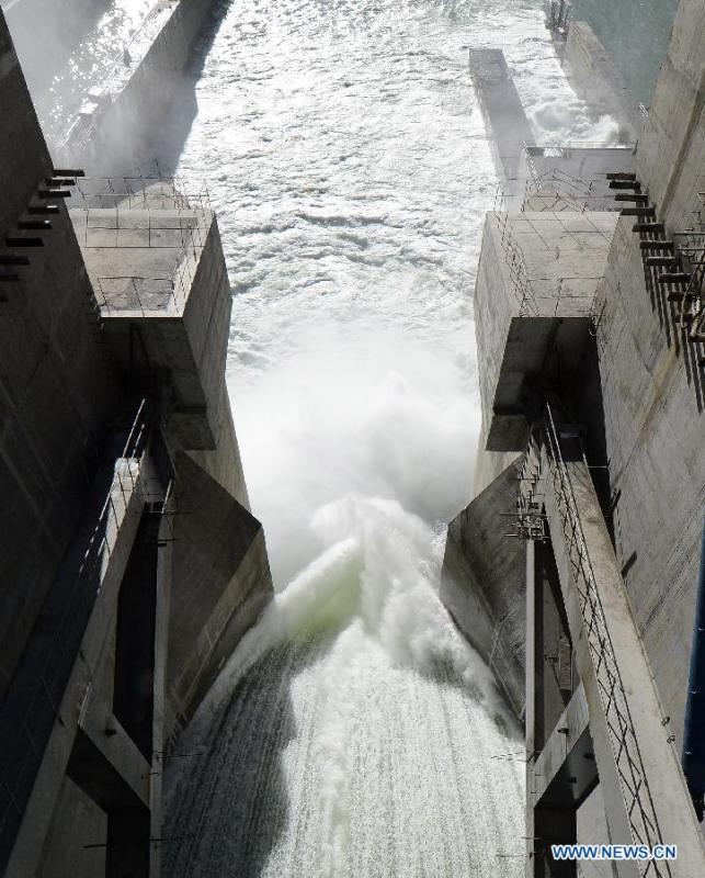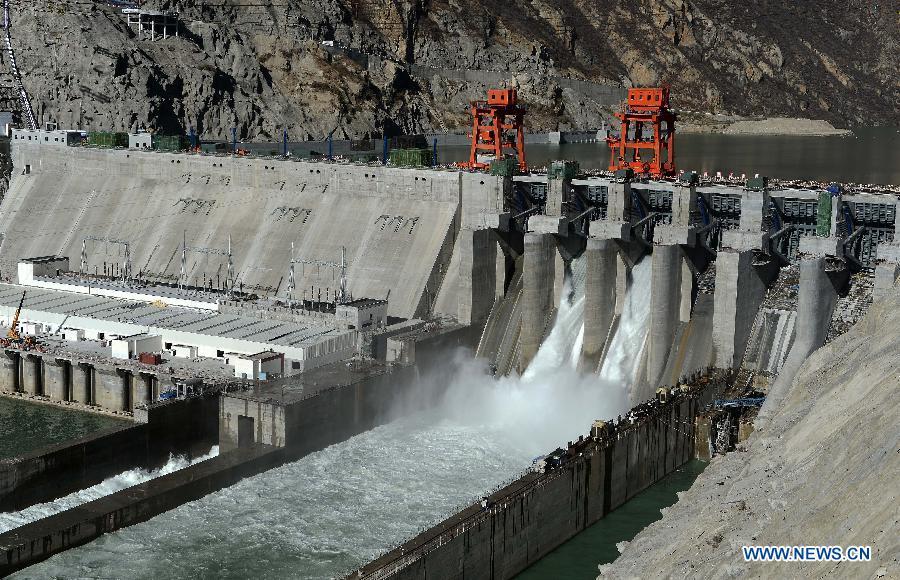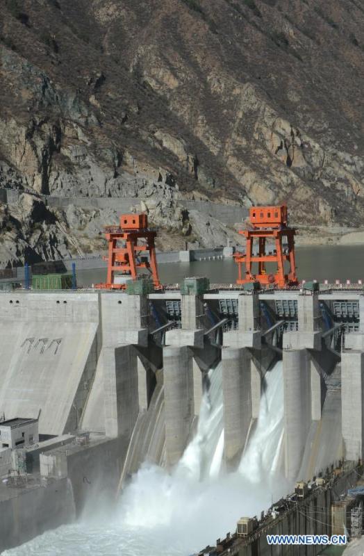 Water is discharged from the dam of Zangmu Hydropower Station in Gyaca County, Shannan Prefecture, southwest China's Tibet Autonomous Region, Nov 22, 2014. This Tibet's largest hydropower station became partly operational on Sunday, harnessing the rich water resources of the Yarlung Zangbo River to empower the development of the electricity-strapped region. (Xinhua/Chogo)