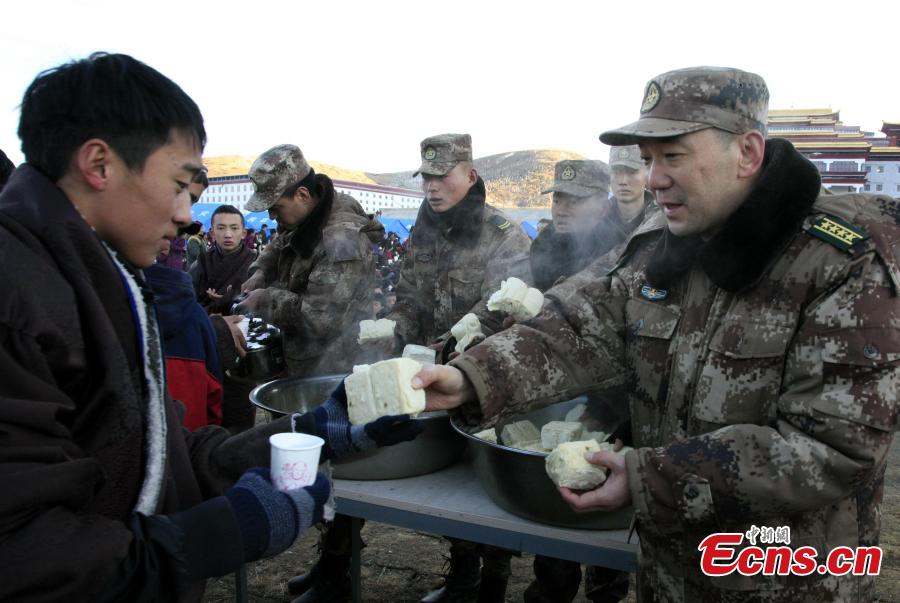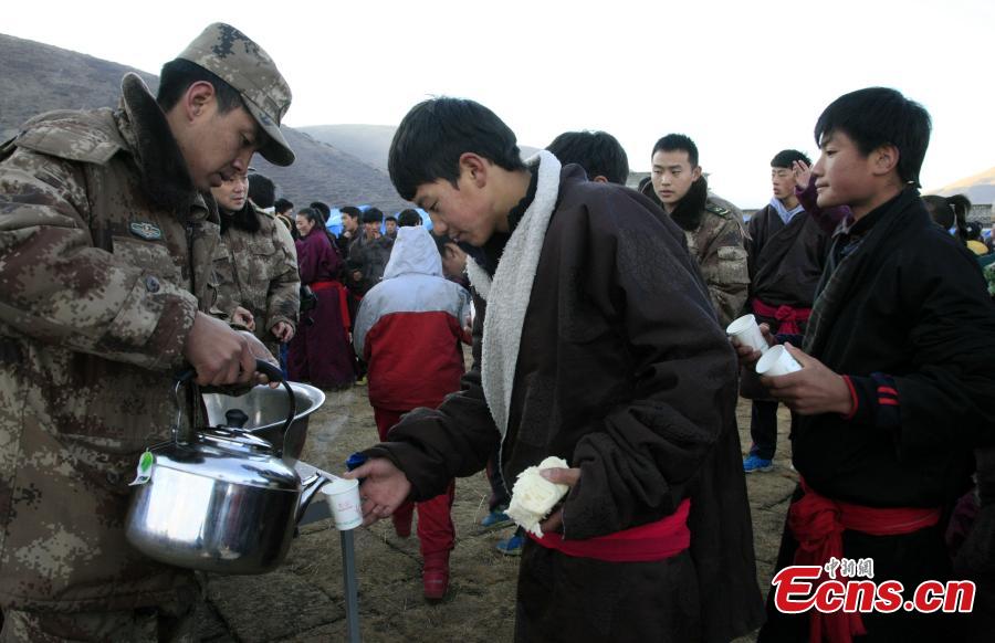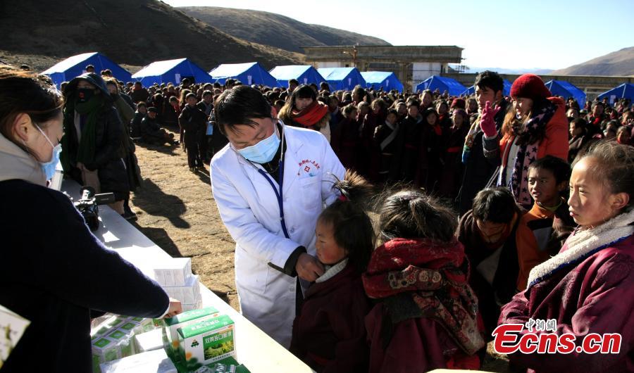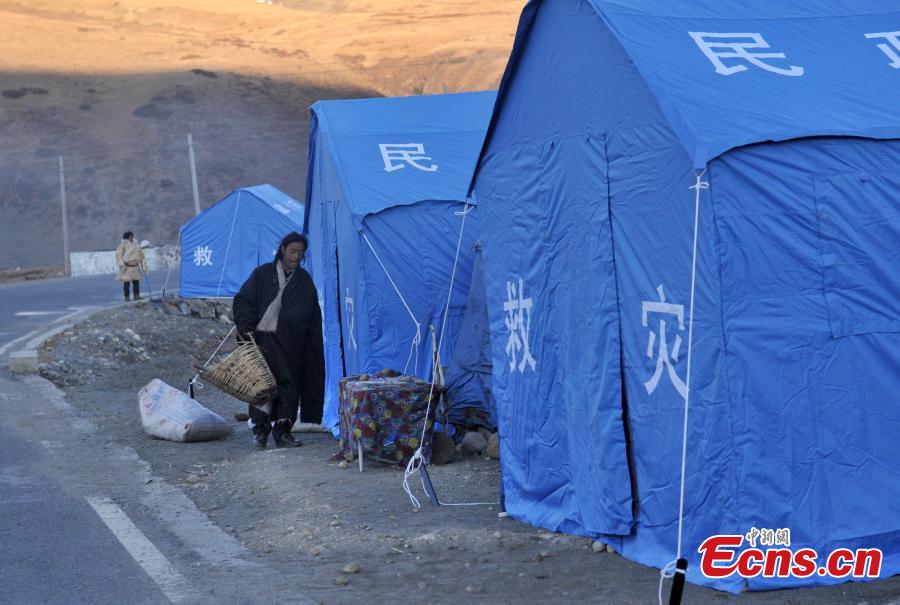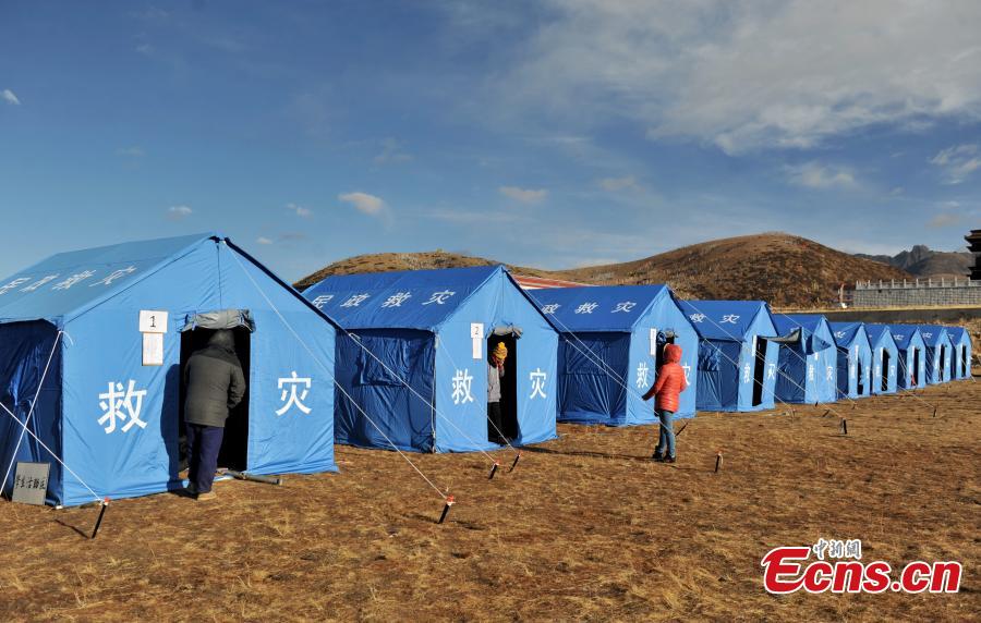 Tents are set up along a road to house quake survivors in Tagong town of Kangding county, Ganzi Tibetan Autonomous Prefecture in Southwest China's Sichuan province on November 23, 2014. Five people were killed after a 6.3 magnitude earthquake struck Kangding on Saturday afternoon. [Photo: China News Service/ Liu Zhongjun]