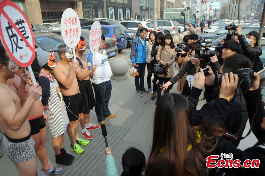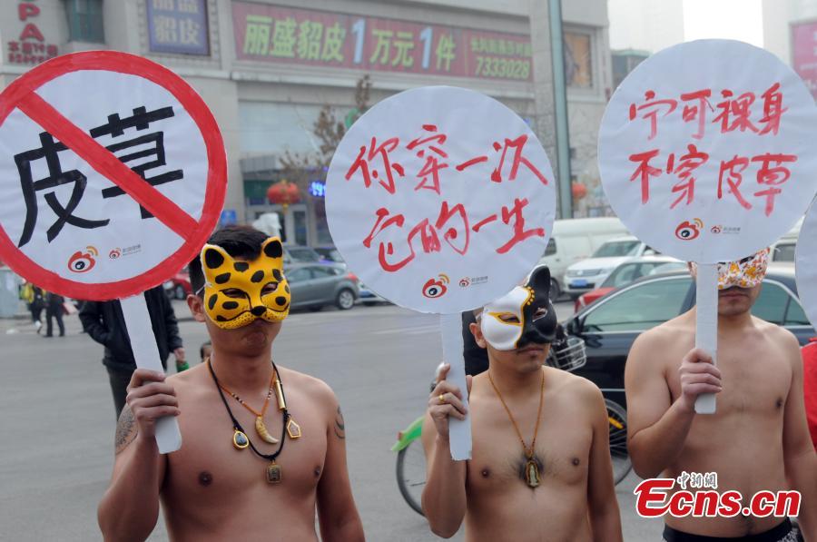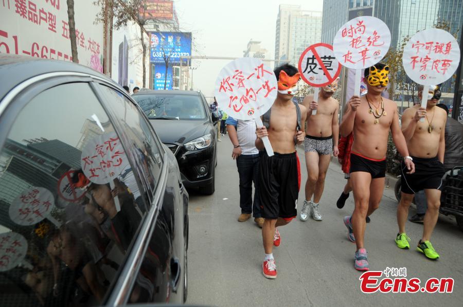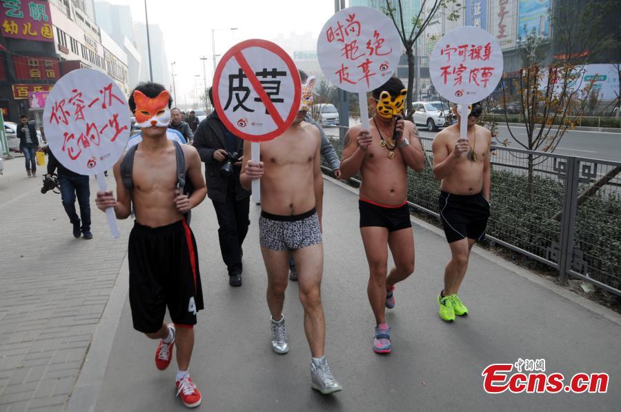 With signs "I'd rather go naked than wear fur," "Say no to fur,"and “For you, it's a fashion choice. For the animals, it's life or death" in hands, anti-fur activists wearing only shorts walk on a street during a campaign in Taiyuan, Shanxi province on November 22, 2014. [Photo: China News Service/ Wu Junjie]
