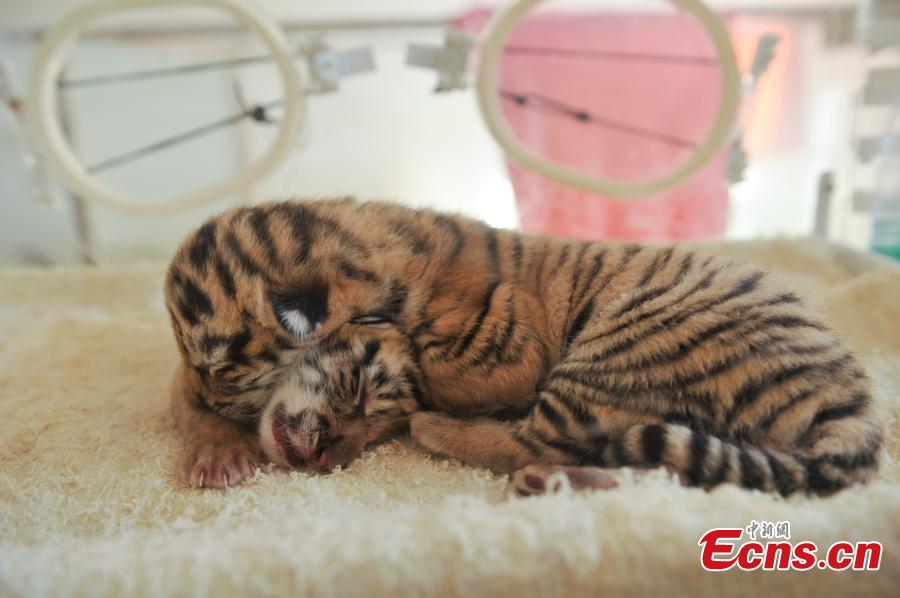 A newborn tiger cub sleeps in an incubator at the breeding center of Yunnan Safari Park in Kunming, Yunnan province on November 24, 2014. [Photo: China News Service/ Liu Ranyang]