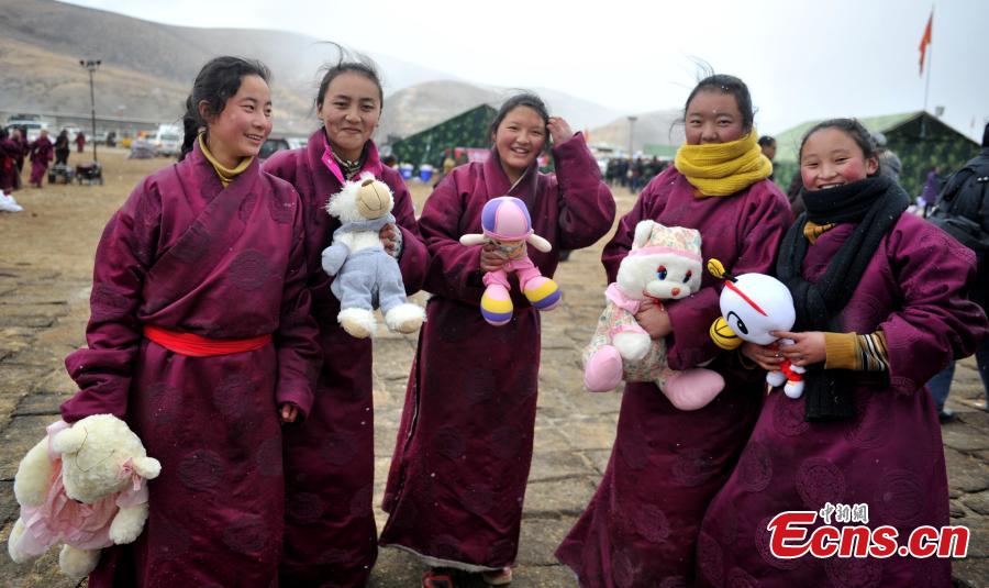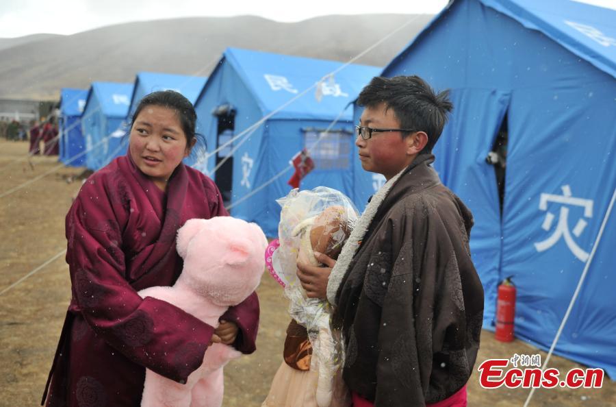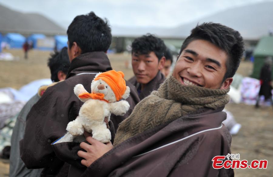 Toys donated by students form Sichuan’s Chengdu put a smile on faces of children in quake-hit zone in Kangding county, Ganzi Tibetan Autonomous Prefecture in Southwest China's Sichuan province on Monday, November 24, 2014. A 6.3-magnitude earthquake hit Kangding county at 4:55 pm, last Saturday. [Photo: China News Service/ Liu Zhongjun]