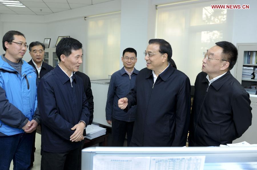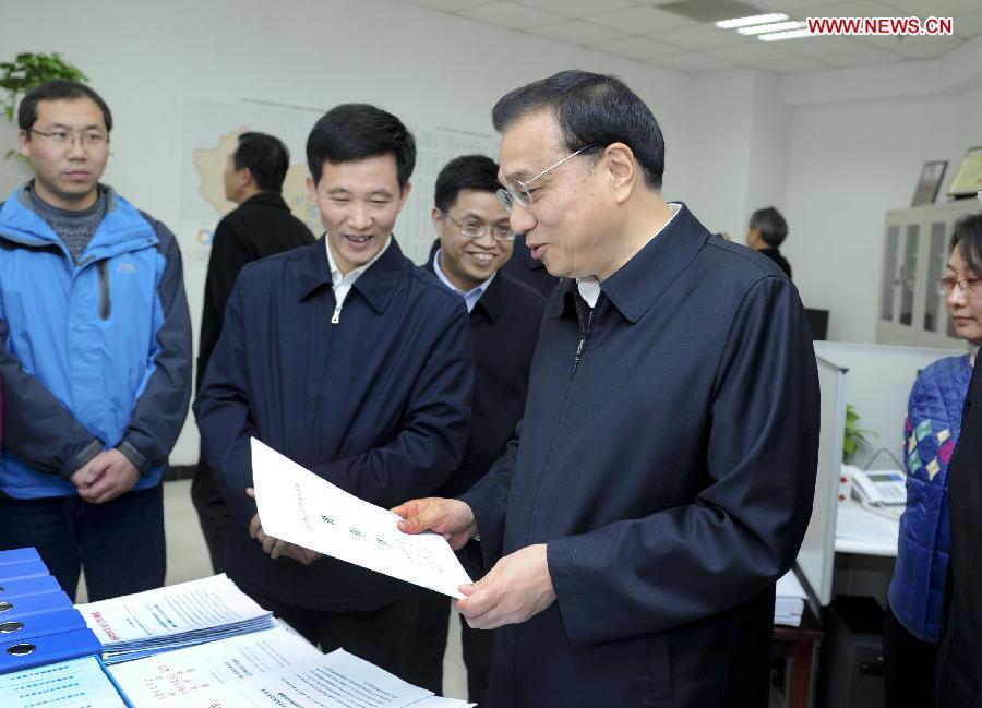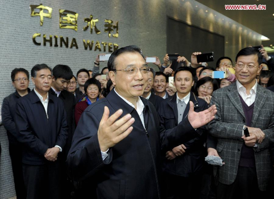Chinese Premier Li Keqiang views a poster of rural drinking water safety project during his visit to the Ministry of Water Resources in Beijing, capital of China, Nov 24, 2014. Li Keqiang made an inspection tour of the Ministry of Water Resources in Beijing on Monday. (Xinhua/Zhang Duo)