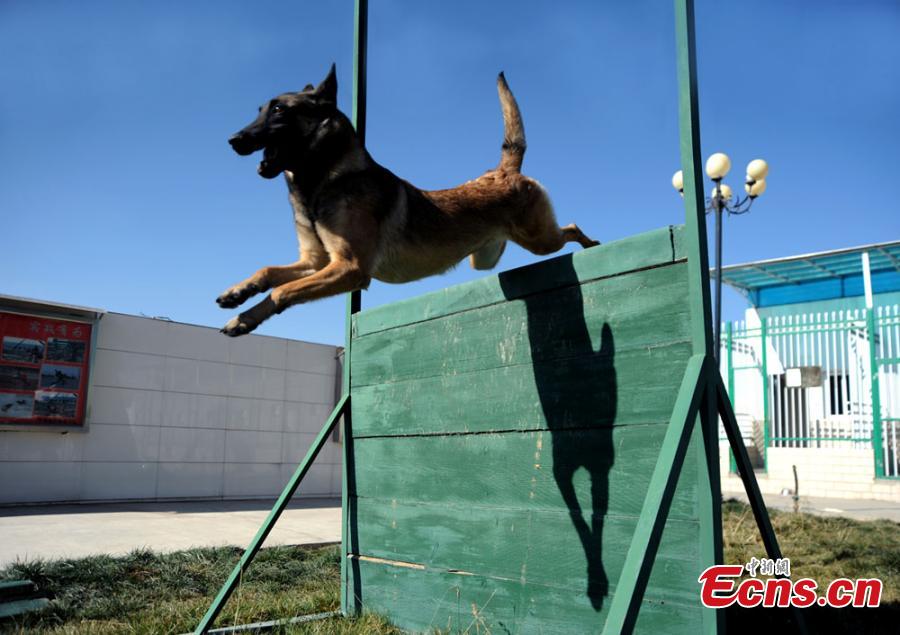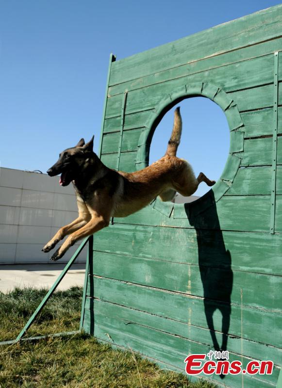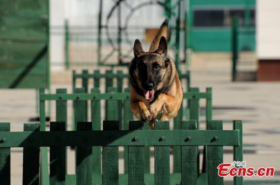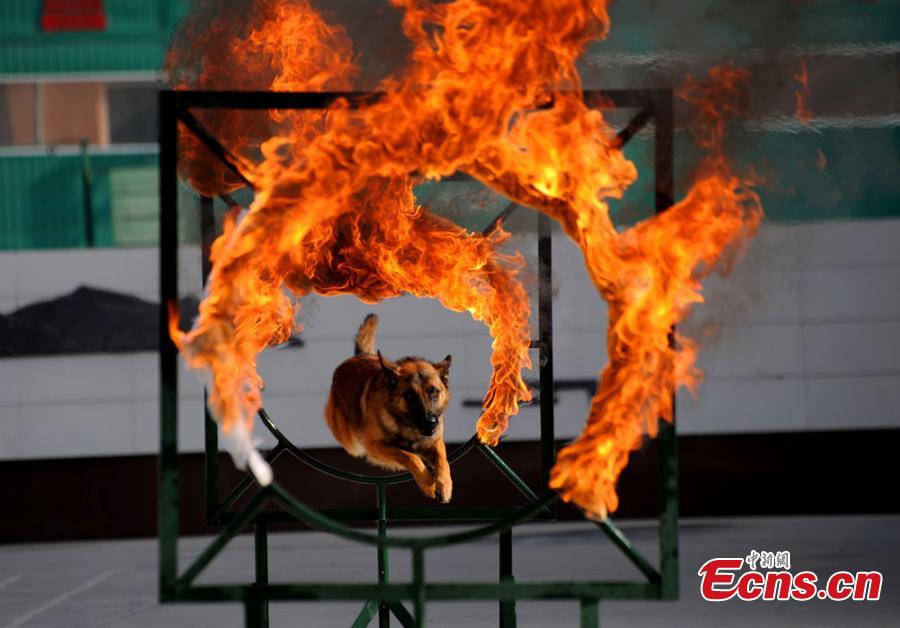 Rescue dogs of a fire brigade in Northwest China’s Gansu province undertake training programs, including jumping through flaming hoops and crossing the barriers. [Photo: China News Service/ Shi Yonghong]