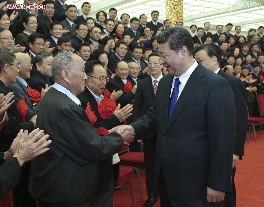 Senior Chinese leaders Xi Jinping, Liu Yunshan, Zhang Gaoli and others meet with representatives of distinguished veteran cadre individuals and groups at the Great Hall of the People in Beijing, capital of China, Nov 26, 2014. (Xinhua/Lan Hongguang)