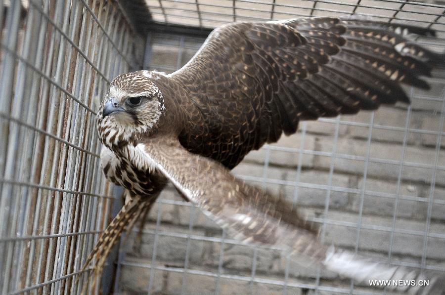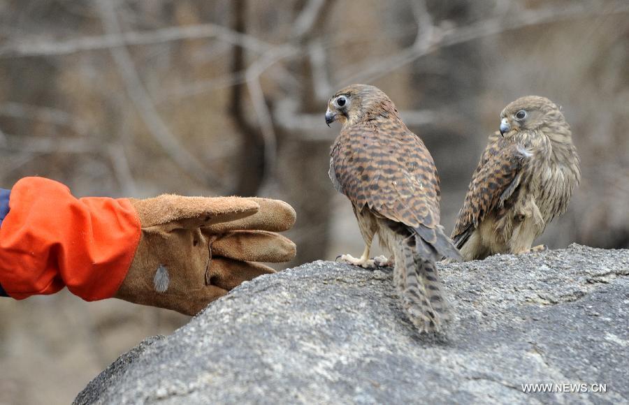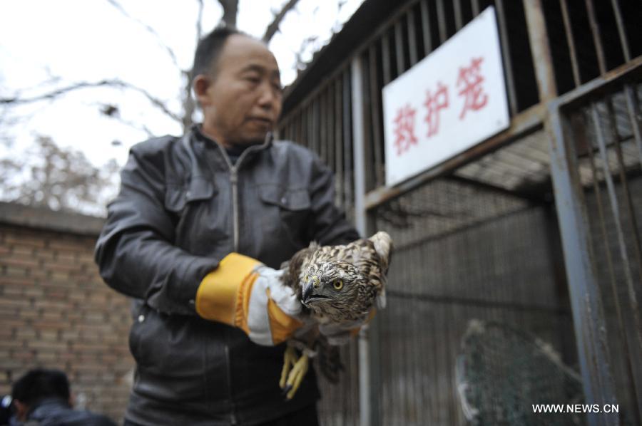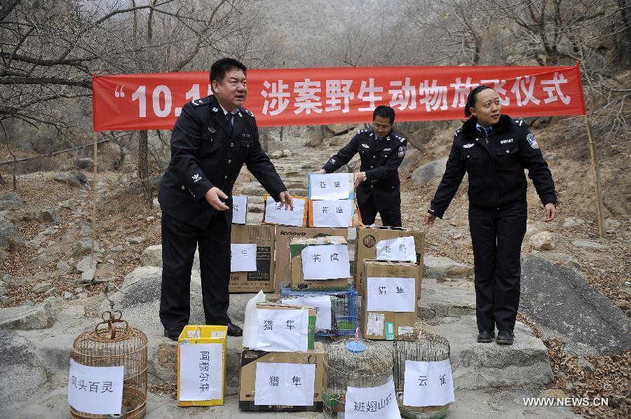 Policemen prepare to release trafficked animals in Yinchuan, capital of northwest China's Ningxia Hui Autonomous Region, Nov 26, 2014. Local police of Ningxia recently uncovered a case of illegal purchasing, transporting and trafficking 24 rare animals, 17 of which are under China's second-class protection, including larks, hawks, and falcons. An event of releasing these trafficked animals was held here on Wednesday. (Xinhua/ Li Ran)