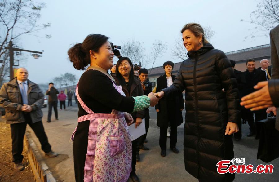 Queen Maxima of the Netherlands (R) shakes hands with villager Wang Yan, as she arrives to visit Wang's noodle restaurant during a local financial service field trip at Dongxingtun village on the outskirts of Beijing, November 26, 2014. [Photo/Agencies]