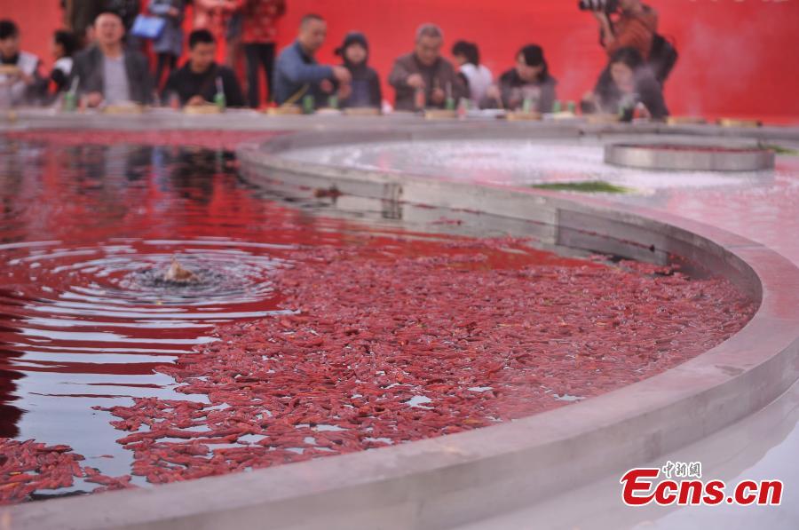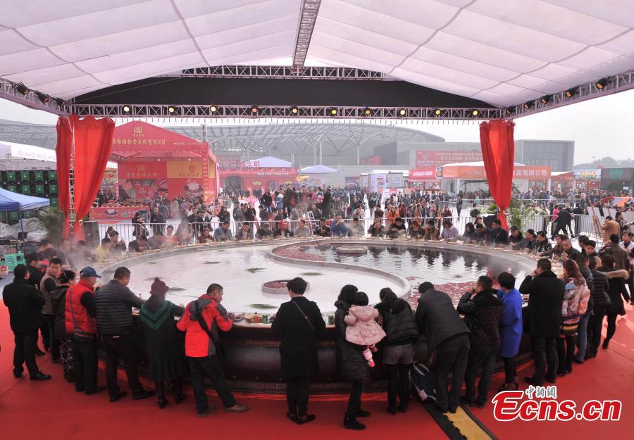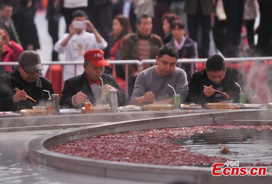People tuck into a huge hotpot during the Hotpot Culture Festival in southwest China's Chongqing, Nov 27, 2014. The pot used to cook the massive meal was more than one meter deep, had a diameter of 10 meters, weighed 31 tons and was large enough to accommodate more than 50 diners simultaneously. [Photo:China News Service/Chen Chao]