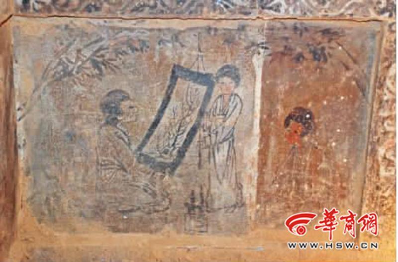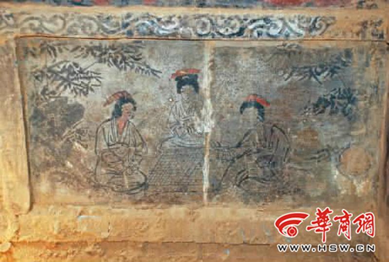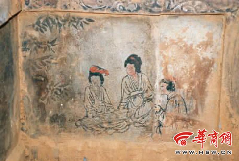 Three women are enjoying music from a traditional Chinese musical instrument in this fresco from Jin Dynasty (1115-1234) unearthed in Yuanzhuang Village, Ganquan County, northwest China's Shaanxi province. [Photo/www.hsw.con]