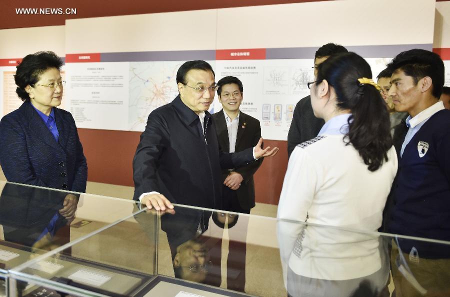 Chinese Premier Li Keqiang visits an exhibition of residential building technology in Beijing, capital of China, Nov. 27, 2014. Li said China's urbanization should be human-centered and improve the quality of people's lives.(Xinhua/Xie Huanchi)