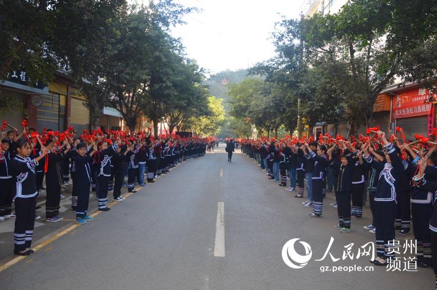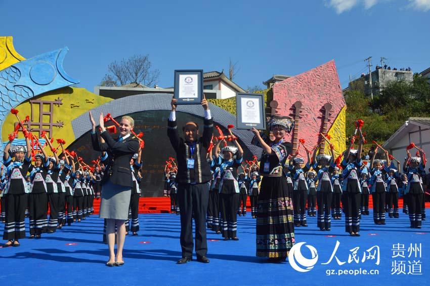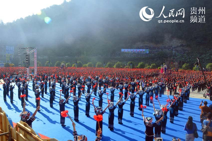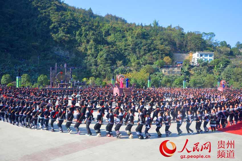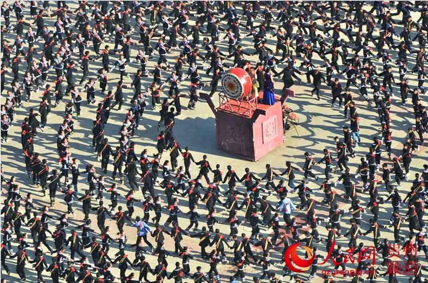 Nearly 10,000 Buyi people (an ethnic group living in south China) in national costumes danced together in Ceheng county, southwest China’s Guizhou province on Nov 29, 2014. A certifier from the Guinness World Record granted the certificate “Buyi bamboo drum dance and Zhuanchang dance Guinness world record” to this dance after the performance. (Photo source: gz.people.cn)
