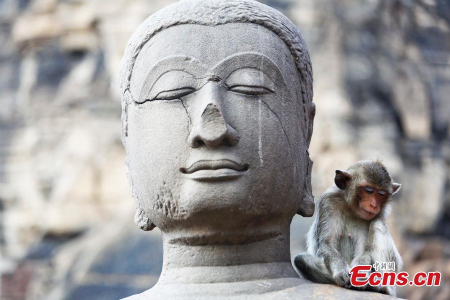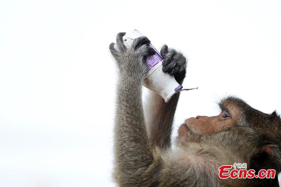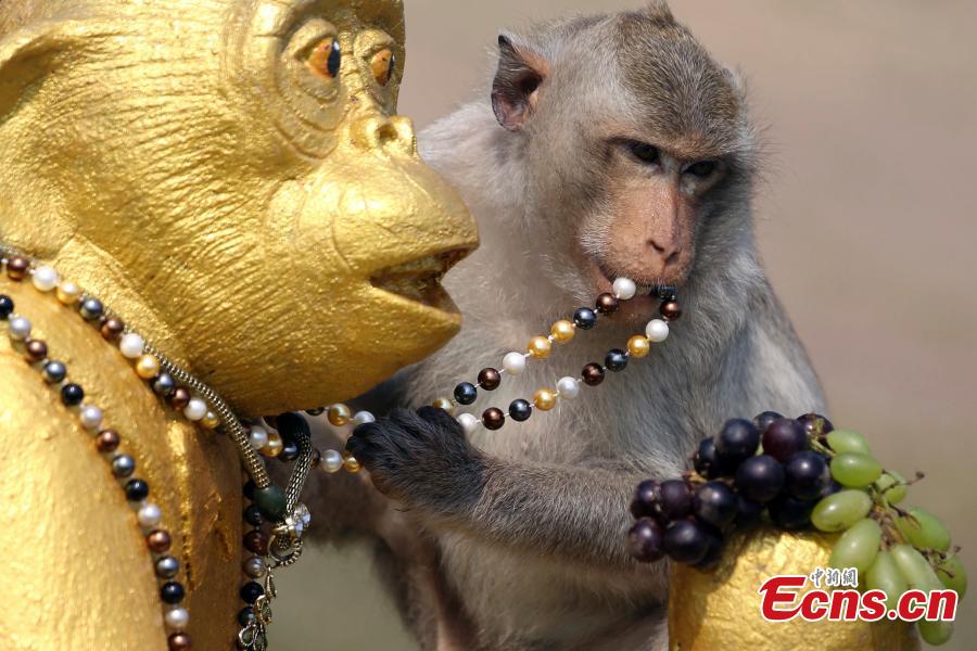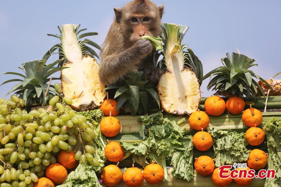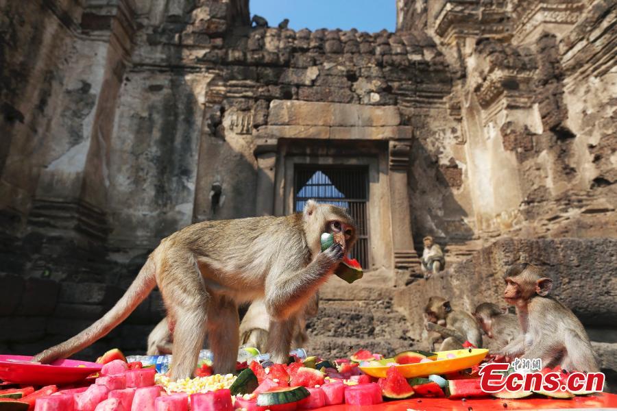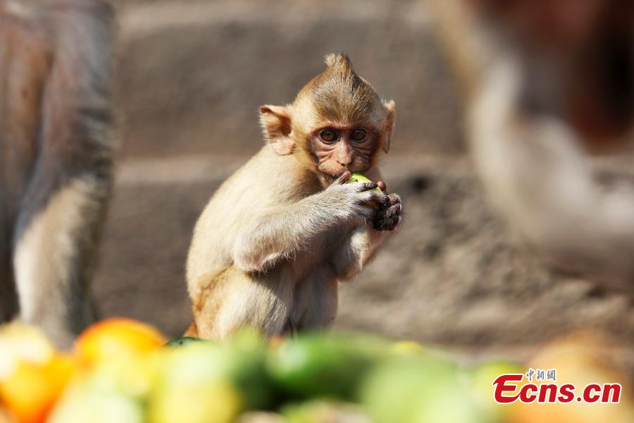 A monkey eats fruit during the Monkey Buffet Festival in the city of Lopburi, North of Bangkok, Thailand, on November 30, 2014. The festival is held every year on the last Sunday of November to promote local tourism. Two tons of fruit, vegetables, sugar and soft drinks have been offered in a banquet to thank the monkeys for drawing tourists in the town.[Photo/Agencies]