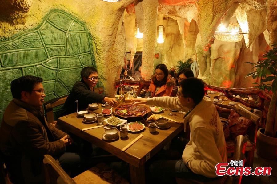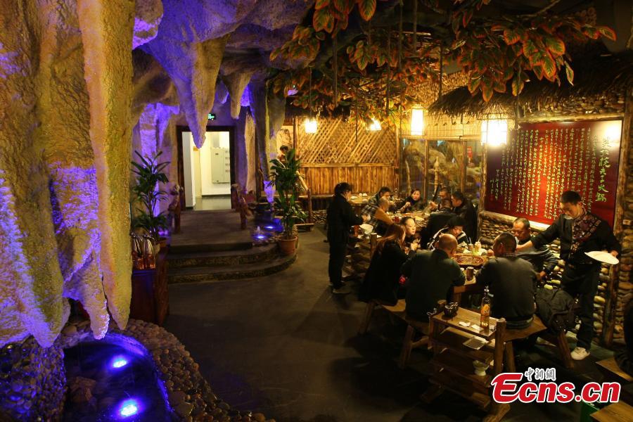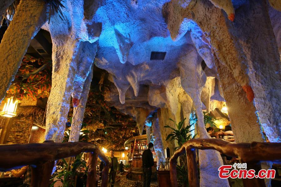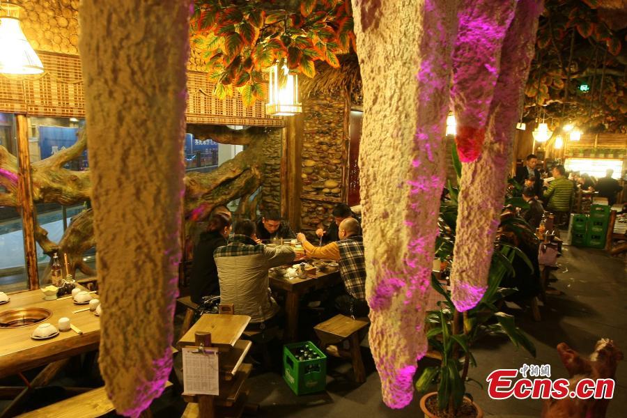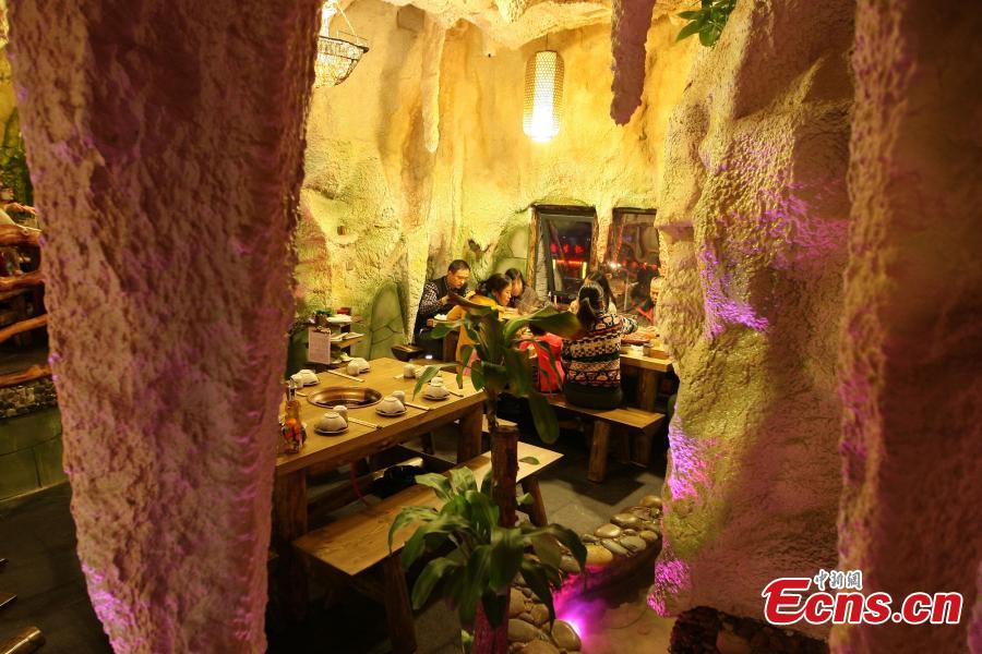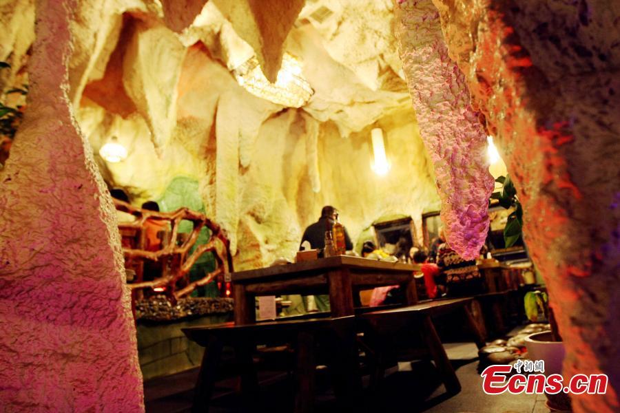 A hot pot restaurant, decorated like a "karst cave," becomes popular in Wanzhou district, Chongqing municipality. The restaurant, which has just more than ten tables, spent about one million Yuan ($162,000) in decoration, sources said. Hot pot is a traditional Chinese meal that people enjoy by sitting around a pot of simmering water, dipping raw foods, such as thinly-sliced meats, fish, vegetables, and noodles, into the water to cook. [Photo: CNSPHOTO/ Zhao Jinchao]