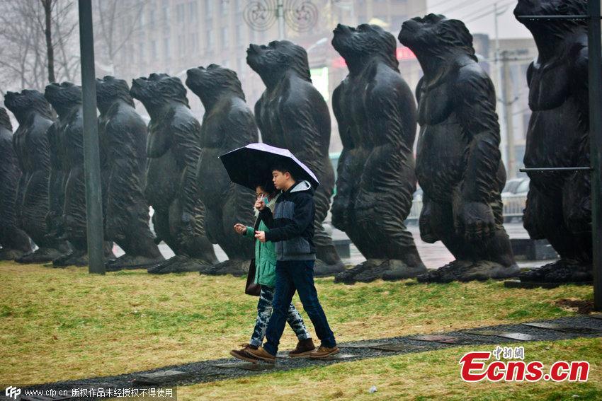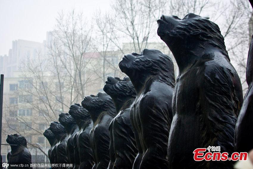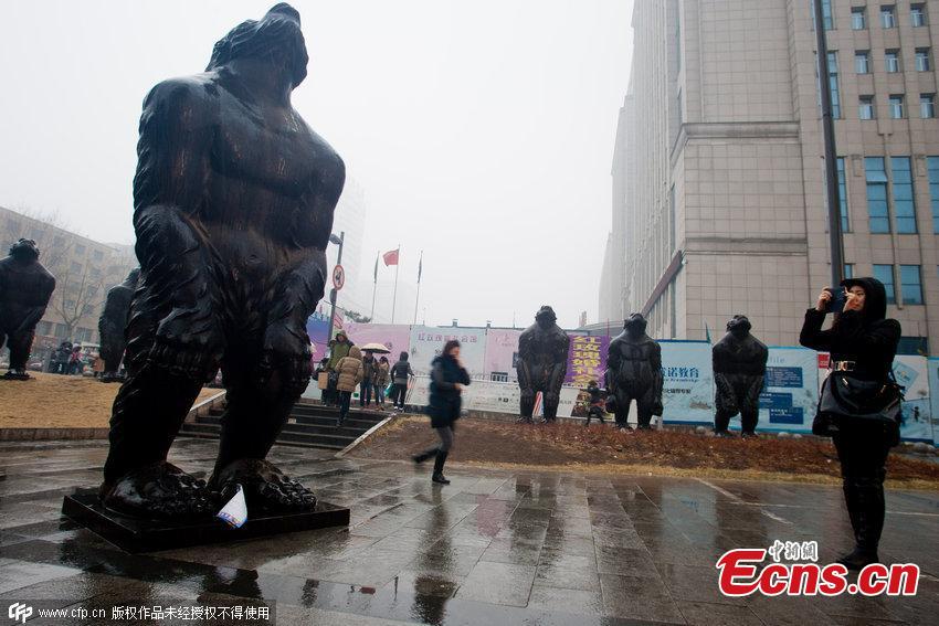 People walk past giant bronze ape sculptures in a square of Changchun, Northeast China’s Jilin province, Nov 30, 2014. Each statue is more than 3 meters high and 36 sculptures cost 36 million yuan ($5.8 million). The sculptures, inspired by works of China’s modern artist Liu Ruowang, symbolize breaking the rules of convention. [Photo/CFP]