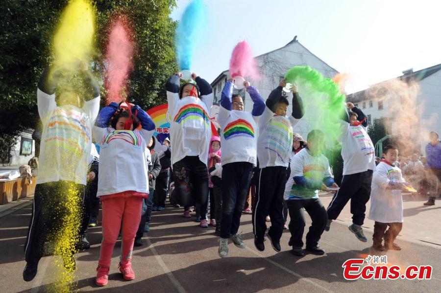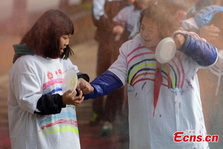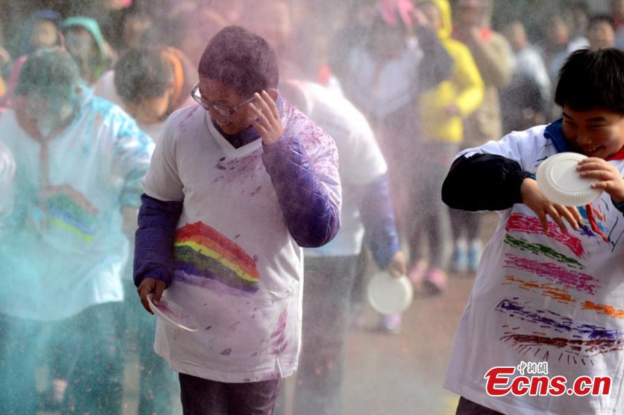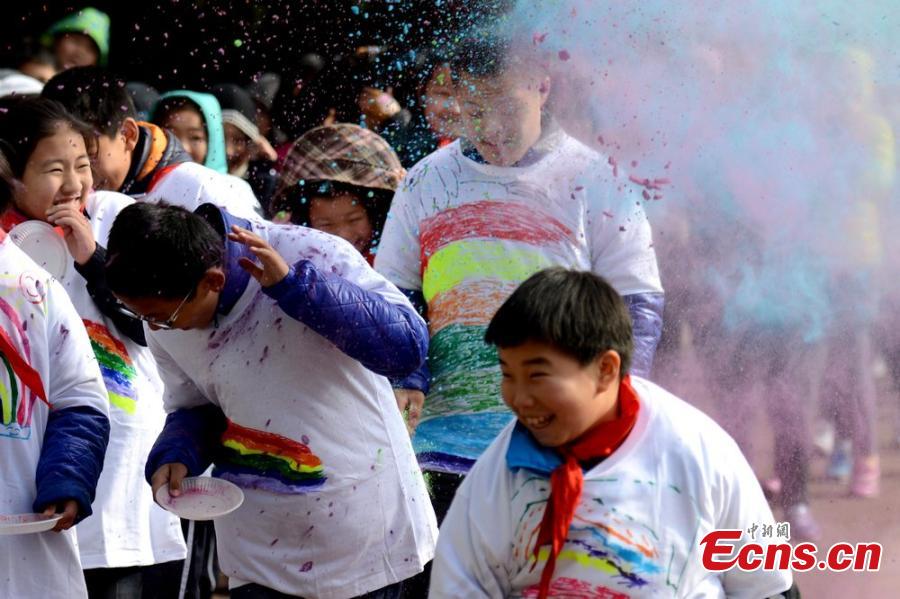 Students have fun in a color run event on the playground of Dongzhong Experimental Primary School in Suzhou, East China's Jiangsu province, Dec 2, 2014. The school, together with a local school for mentally challenged students co-held the event ahead of the International Day of Disabled Persons which falls on Dec 3. [Photo: China News Service/ Wang Sizhe]