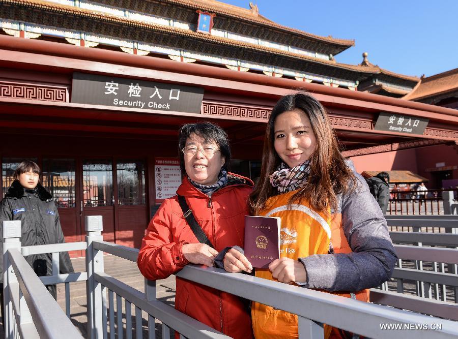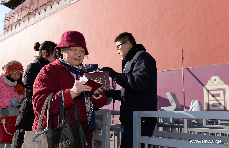 A visitor (R) shows her teacher certificate near the entrance to the Palace Museum in Beijing, China, Dec 3, 2014. The Palace Museum started waiving the entry fee for certain Chinese residents on Wednesday. Chinese teachers, students, soldiers, police, medical staff and volunteers will be able to visit the museum for free on the first Wednesday of each month from December 2014 to April 2015. The initiative aims to foster interest from these key groups of society in the popular ancient Chinese palace during the museum's quieter months, while at the same time reducing the hordes of tourists during high season. (Xinhua/Li He)