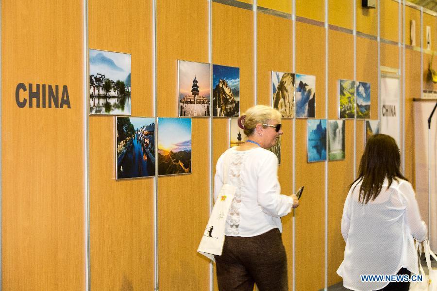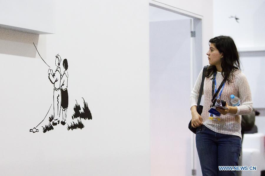 Pedestrians walk past a wall of photos of Chinese landscapes at the China Pavilion during the UN Climate Change Conference in Lima, capital of Peru, Dec 3, 2014. The activities in China Pavilion, which kicks off on Dec 5, will present 17 events including forums and press conferences featuring China's efforts and achievements in addressing the climate change. (Xinhua/Xu Zijian)