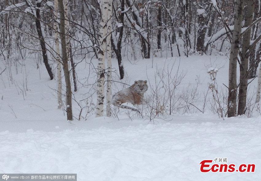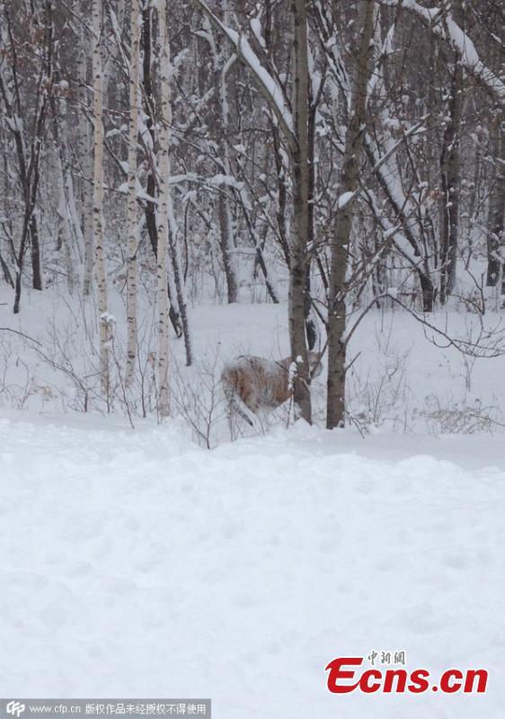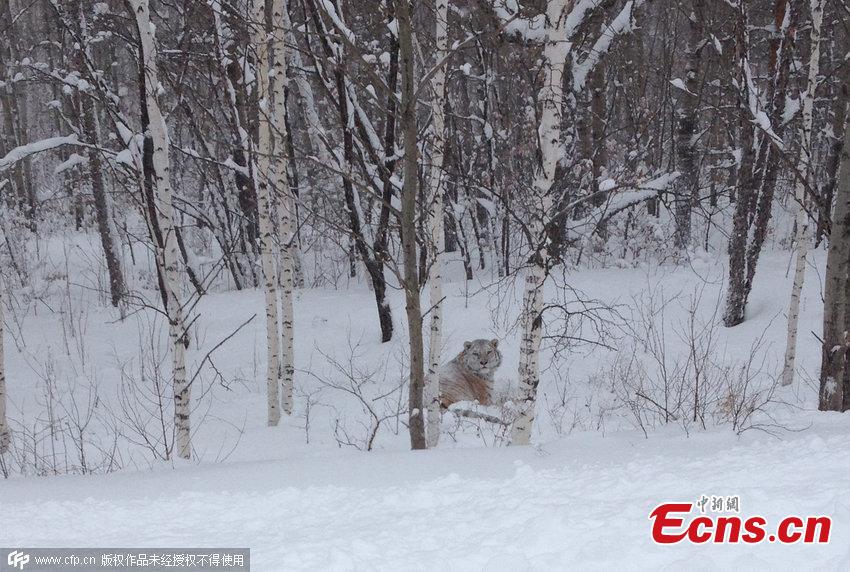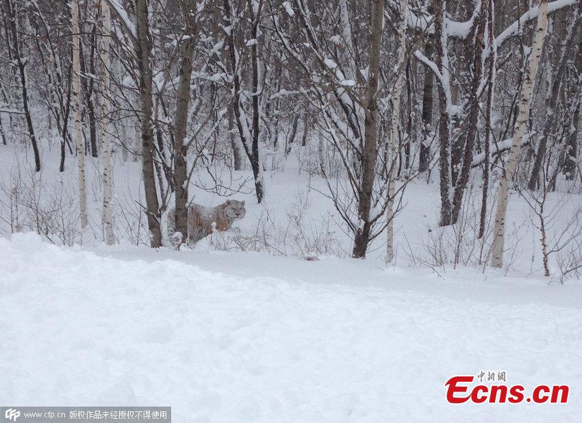A Siberian tiger is spotted near an oil station in Fuyuan county, Northeast China's Heilongjiang province, Dec 2, 2014. It later disappeared in the forest. The tiger has been confirmed to be Ustin, a Siberian tiger set free by the Russia President Vladmir Putin. Ustin was previously suspected of raiding a goat farm on Heixiazi Island of the county. [Photo/CFP]