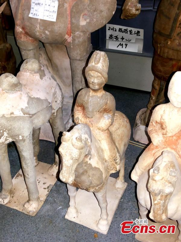 Over 70 funerary objects, including figurines of Hu people (a general term for people of non-Han origin)and potteries of camel and horse, are unearthed from a couple’s tomb of Tang Dynasty (618-907) in Huayin, Central China’s Shaanxi province, Dec 4, 2014. Song Su, the owner of this tomb, used to be a county magistrate of Dunhuang during the reign of Emperor Gaozong (649 to 683) of Tang Dynasty, according to Liu Daiyun, an associate researcher from Shaanxi Provincial Institute of Archaeology. Experts think that the discovery of this tomb will provide materials for researches on the history of cultural exchange on the Silk Road. [Photo: China News Agency/ Zhang Yuan]