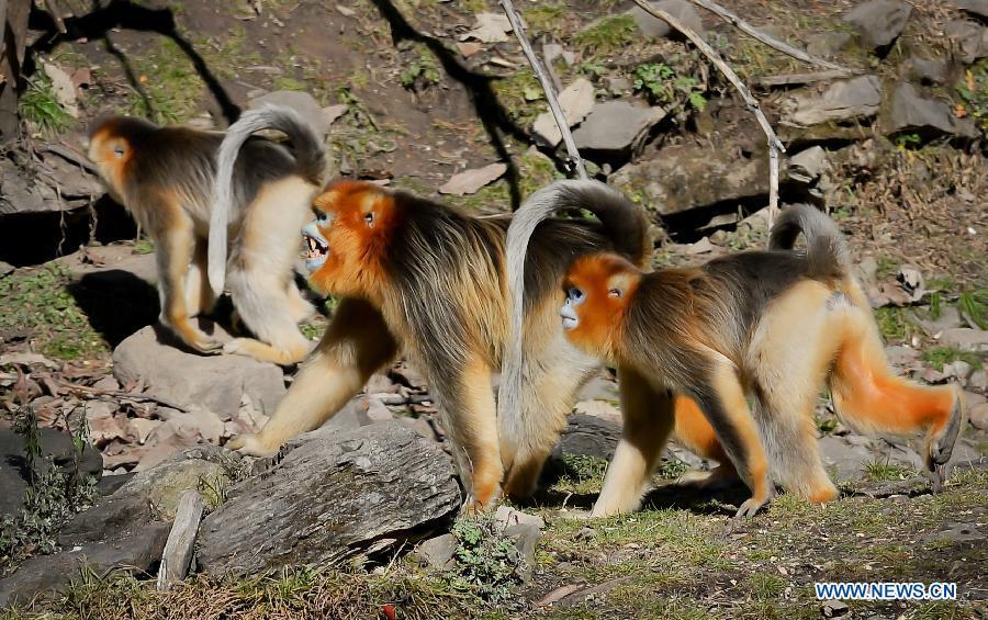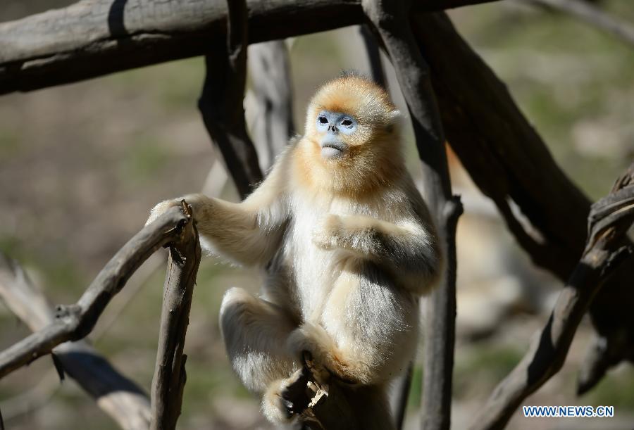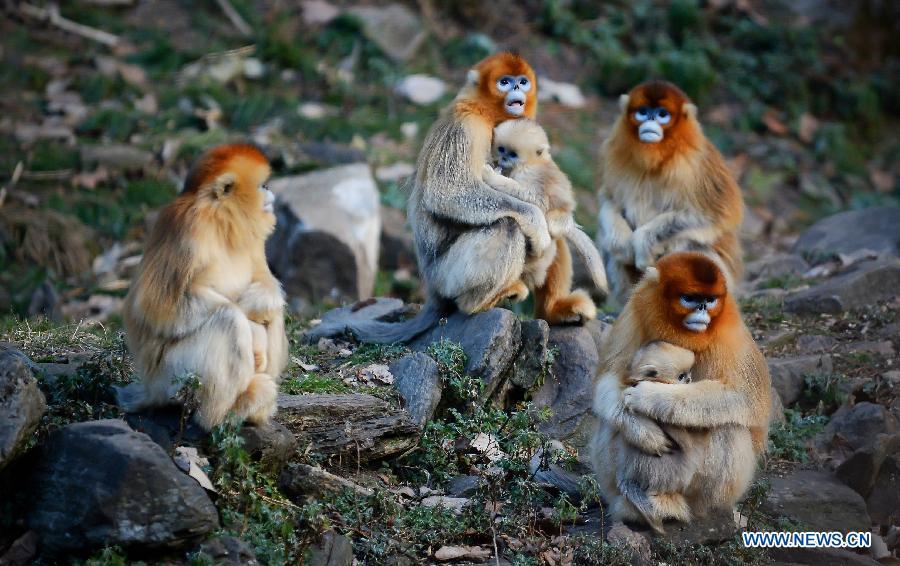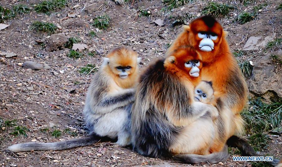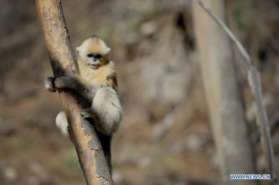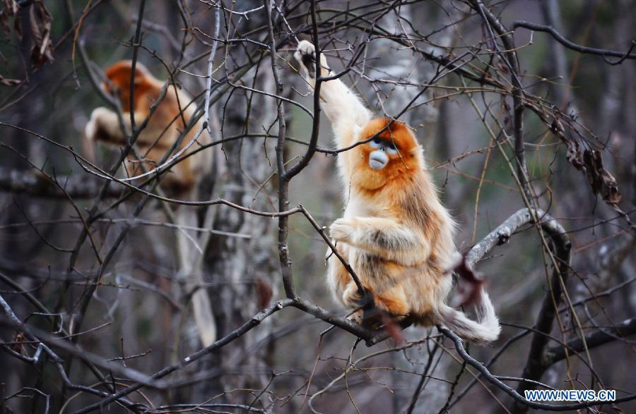 A wild golden monkey is seen at the Qinling Mountains in Ningshan County, northwest China's Shaanxi province, Dec 4, 2014. The number of wild golden monkeys at the Qinling Mountains has increased to about 5,000, according to Shaanxi provincial forestry department. (Xinhua/Liu Xiao)