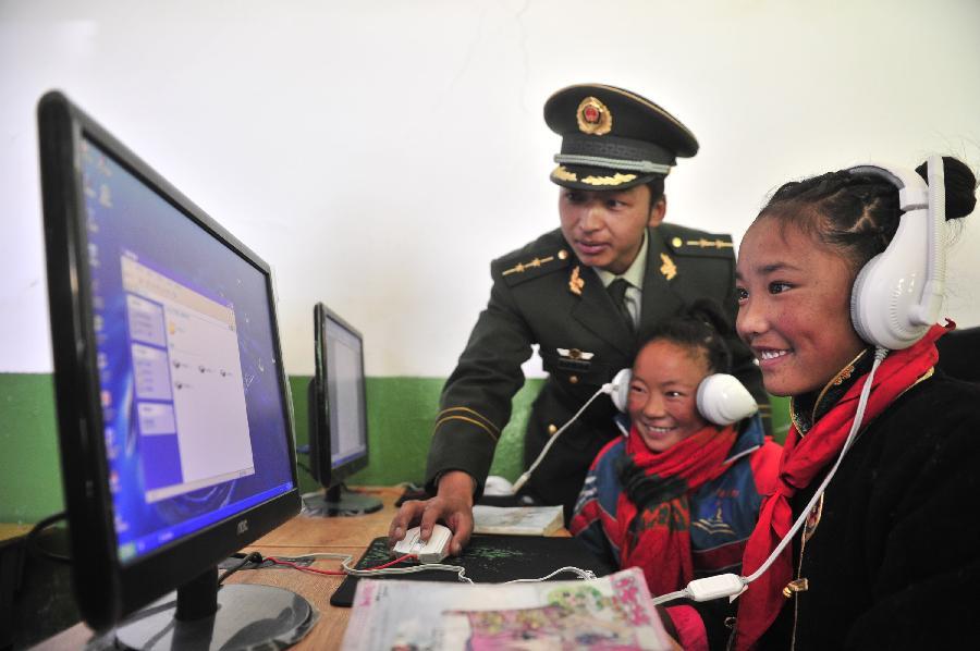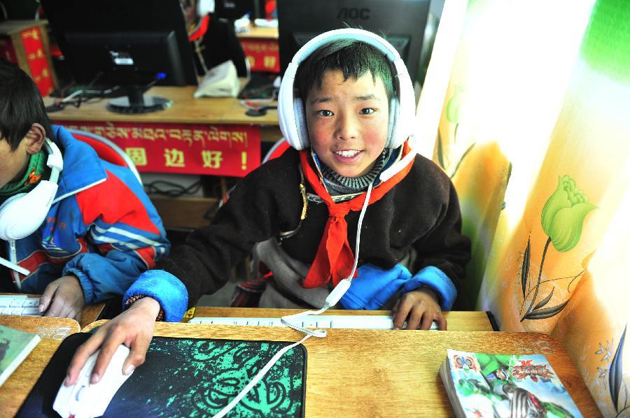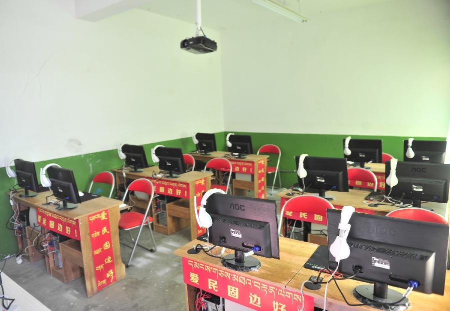 Photo taken on Dec. 5, 2014 shows a computer classroom in Pumaqangtang Township Primary School in Nagarze County, southwest China's Tibet Autonomous Region. The electronic classroom was set up under the help of local border guards and put into use on Friday. Located in the nation's highest township at the altitude of 5,373 meters, the primary school has played an important role for local compulsory education since its establishment in 1986. (Xinhua/Liu Kun)