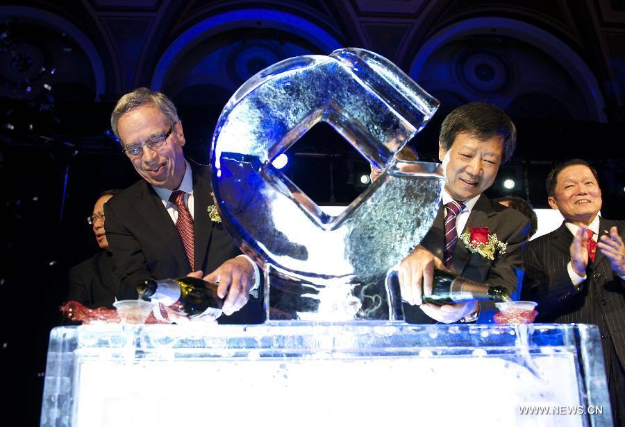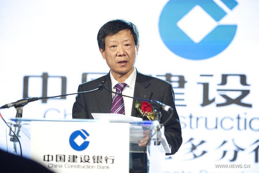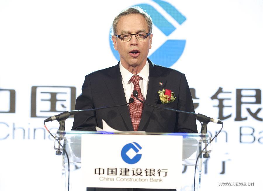 Canadian Finance Minister Joe Oliver (front, L) and Guo You (front, R), Chief Supervisor of China Construction Bank, attend the launching of China Construction Bank Canada Branch, in Toronto, Canada, Dec.5, 2014. China Construction Bank Canada Branch officially declared its opening for business on Friday, marking the first branch of a bank from the Chinese mainland approved to be established in Canada. (Xinhua/Li Haitao)