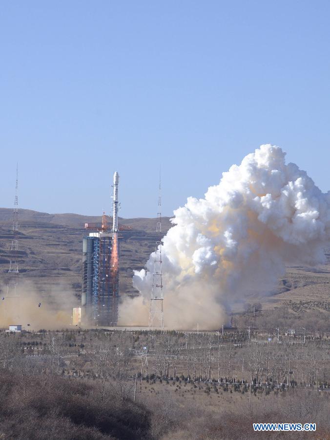 A Chinese Long March-4B rocket carrying the CBERS-4 satellite, jointly developed with Brazil, blasts off in Taiyuan satellite launch center in north China's Shanxi province, Dec 7, 2014. It was the 200th launch of the Long March rocket family since April 24, 1970 when a Long March-1 successfully carried China's first satellite, Dongfanghong-1, into space. (Xinhua/Tian Zhaoyun)