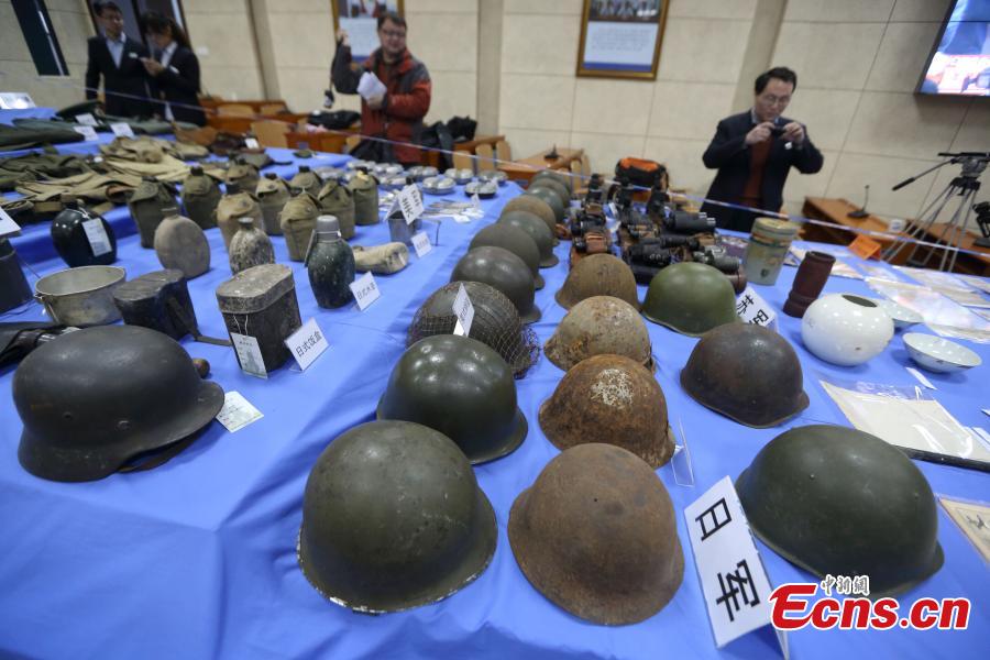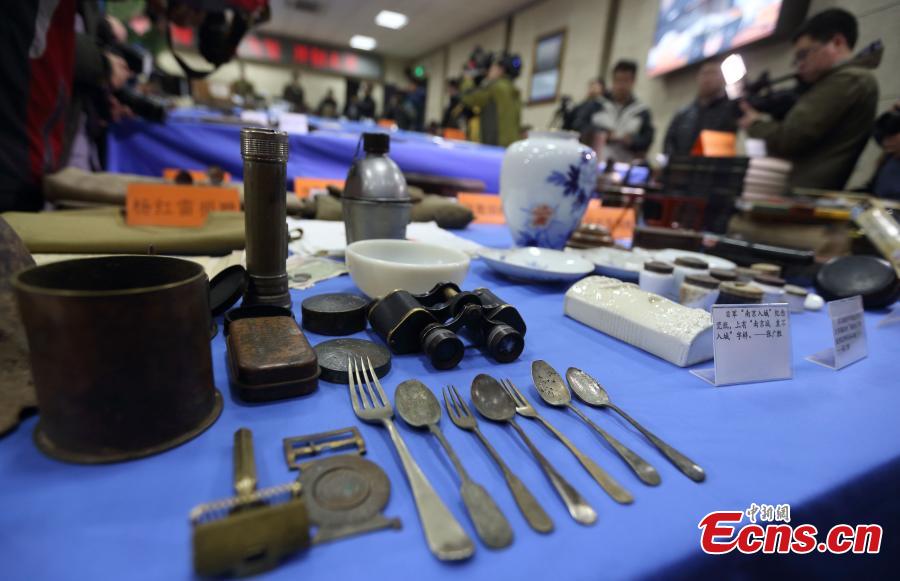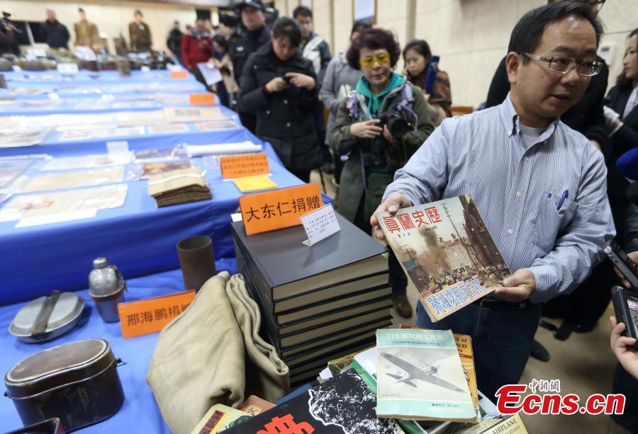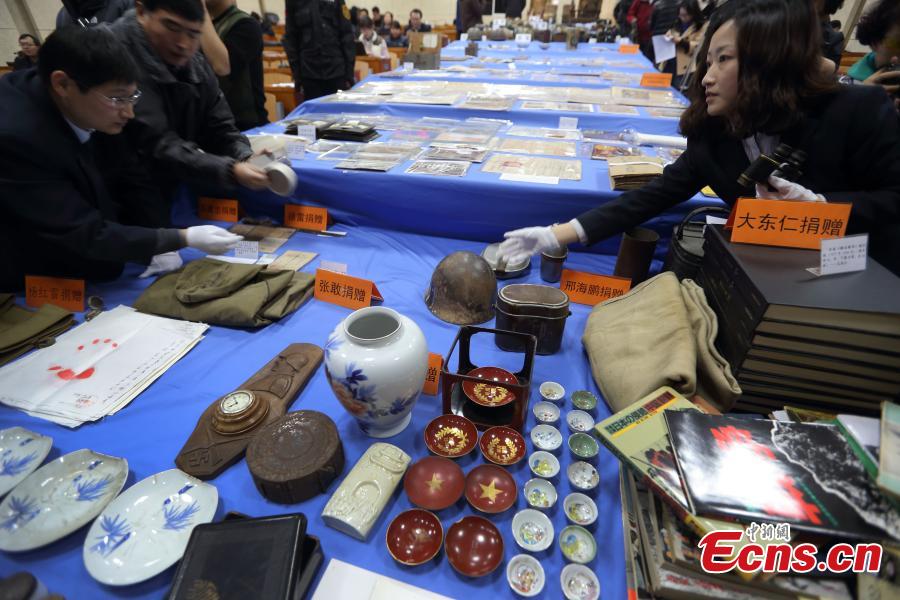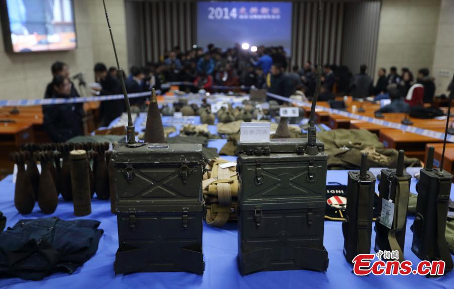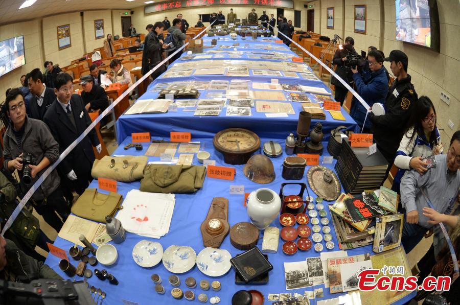 Newly collected items and historical records related to the crimes by Japanese aggressors during the Nanjing Massacre in 1937 are displayed at a press conference in Nanjing, East China’s Jiangsu province, Dec 8, 2014. The Nanjing Massacre Memorial Hall Monday displayed 7,602 items and historical records, including military equipment of Japanese soldiers, news photos and telescopes collected from 14 countries. China has set December 13 as the first national memorial day to commemorate those killed by Japanese aggressors during the Nanjing Massacre. [Photo: China News Service/Yang Bo]