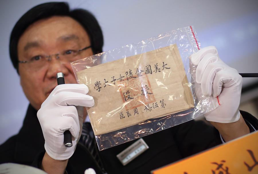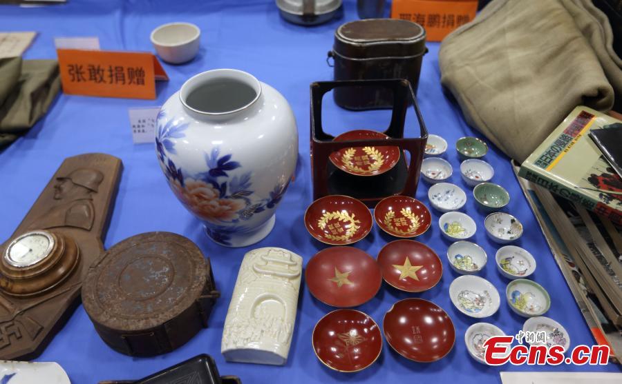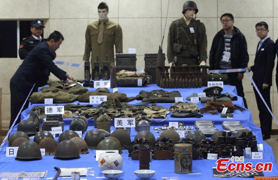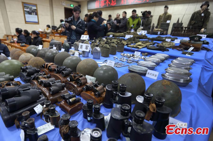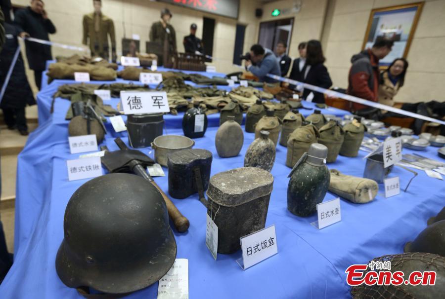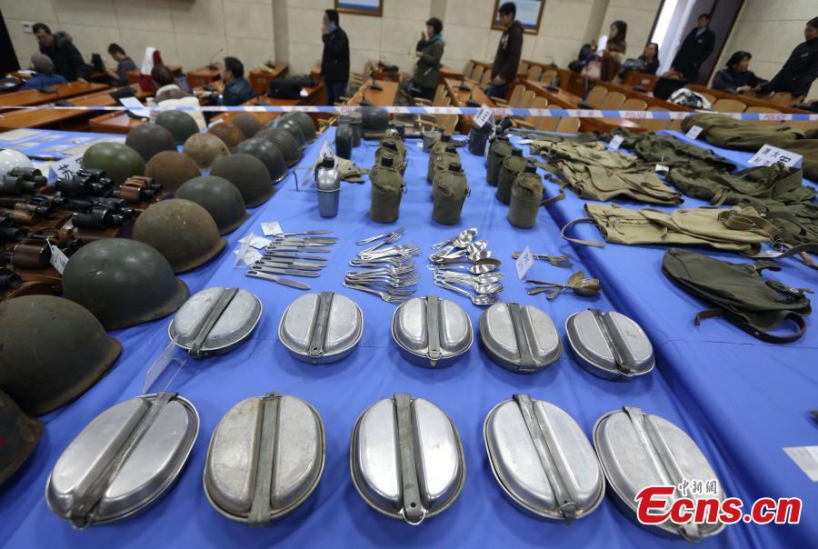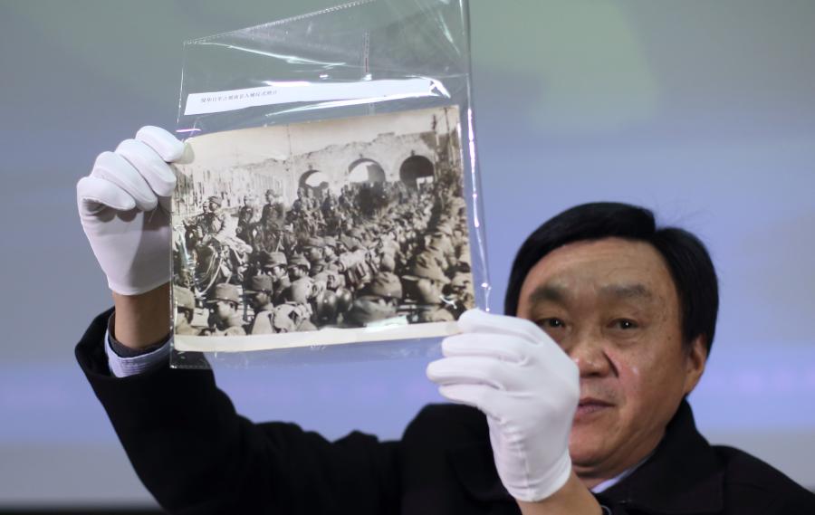 Newly collected items and historical records related to the crimes by Japanese aggressors during the Nanjing Massacre in 1937 are displayed at a press conference in Nanjing, East China’s Jiangsu province, Dec 8, 2014. The Nanjing Massacre Memorial Hall Monday displayed 7,602 items and historical records, including military equipment of Japanese soldiers, news photos and telescopes collected from 14 countries. China has set December 13 as the first national memorial day to commemorate those killed by Japanese aggressors during the Nanjing Massacre. [Photo: China News Service/Yang Bo]
