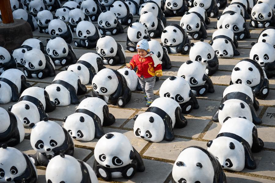A boy has fun with fiberglass pandas which are displayed in Hefei, capital of east China's Anhui province, Dec 8, 2014. (Xinhua/Zhang Duan)
