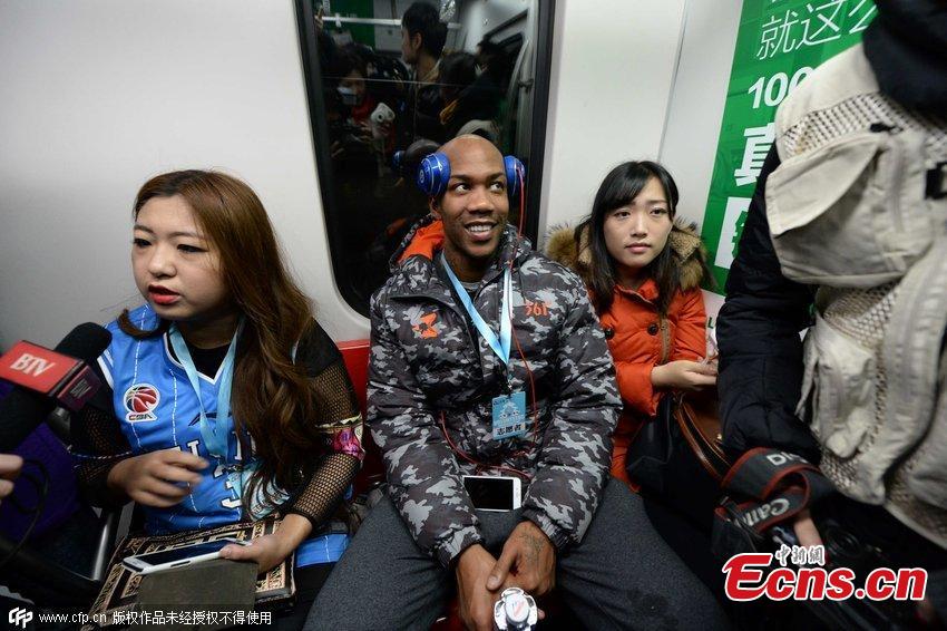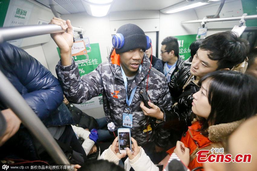 Former NBA star Stephon Marbury is surrounded by fans on a subway train in Beijing on December 8, 2014. Serving as a volunteer, Marbury was on the train to clean illegal adlets. [Photo/ CFP]