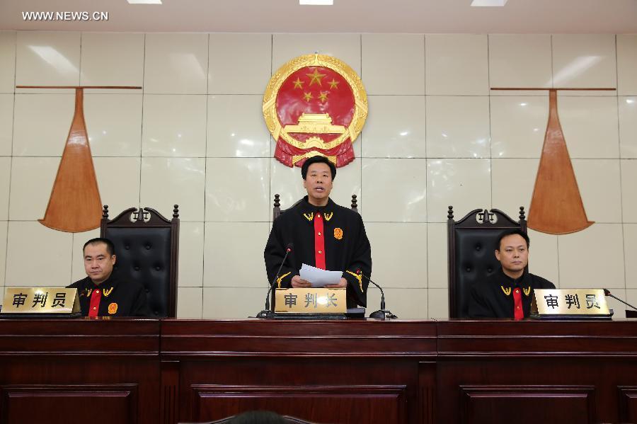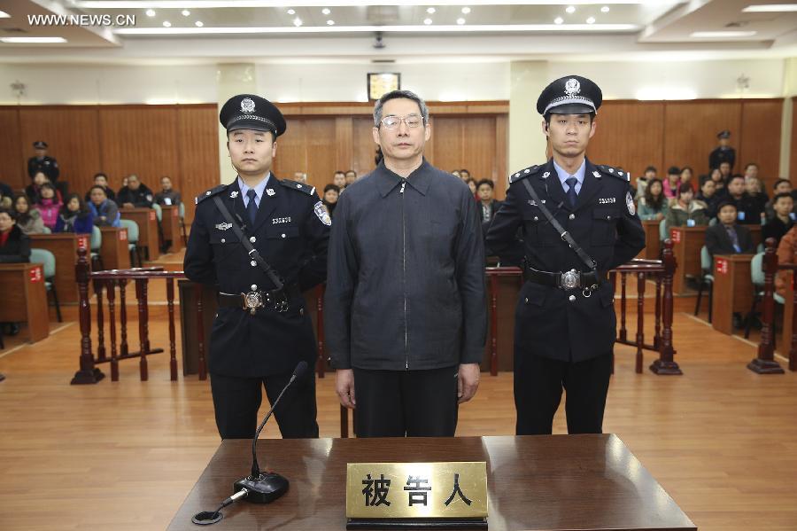 Liu Tienan (C), a former senior economic planning official, stands trial at the Langfang Intermediate People's Court in Langfang, north China's Hebei province, Dec 10, 2014. Liu Tienan, former deputy head of the National Development and Reform Commission and former head of the National Energy Administration, was convicted of bribery and sentenced to life imprisonment by the Langfang Intermediate People's Court on Dec 10. (Xinhua/Langfang Intermediate People's Court)