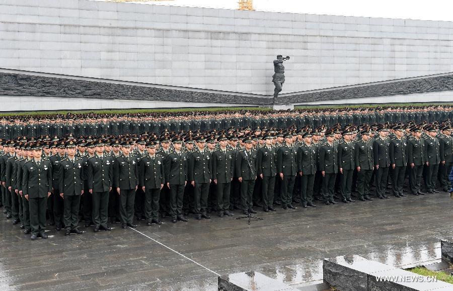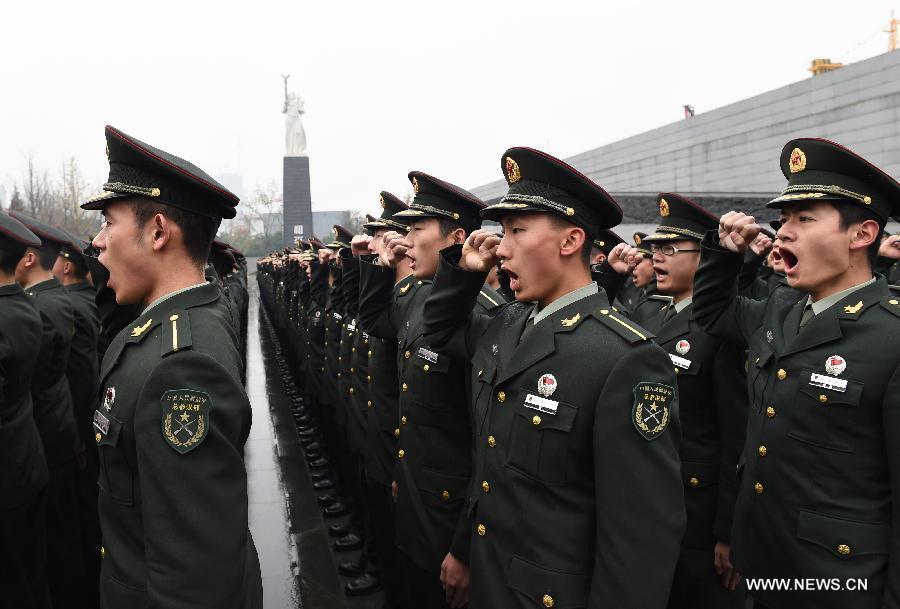 Soldiers of the People's Liberation Army (PLA) swear during a memorial ceremony at the Memorial Hall of the Victims in Nanjing Massacre by Japanese Invaders in Nanjing, Dec 10, 2014. (Xinhua/Sun Can)