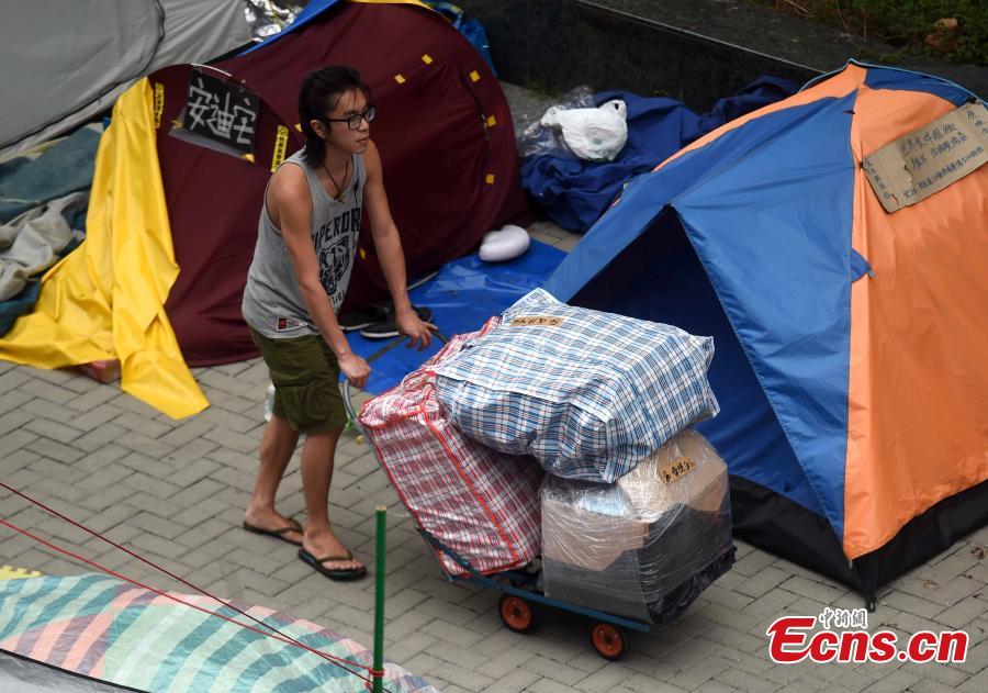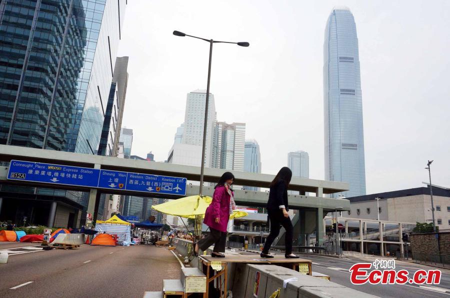 Removed road blocks are seen stacked on a street in Hong Kong on Wednesday, December 10, 2014. Hong Kong's Chief Secretary Carrie Lam on Wednesday appealed to protesters to pack their belongings and leave occupied areas before Hong Kong police start clearance operations on Thursday. Secretary for Security Lai Tung-kwok said on the same day that police will help bailiffs enforce court injunctions on Thursday and reopen blocked roads in Admiralty. [Photo: China News Service/ Hong Shaokui]