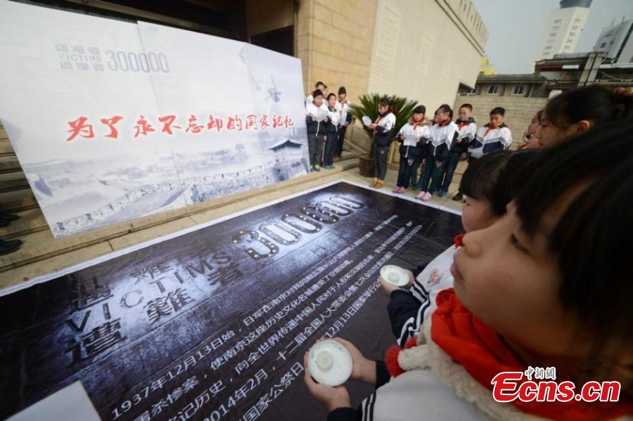 Primary school students light candles during a ceremony to honor victims of the Nanjing Massacre at the Museum of the Revolution in Suzhou, Jiangsu province on December 11, 2014. Students used candles to form the pattern of “300,000,” the number of victims in the massacre. [Photo/ Wang Sizhe]