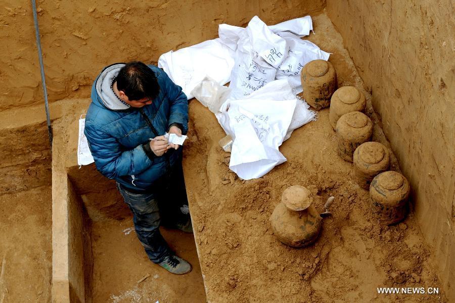 An ancient tomb group from the Han Dynasty recently was discovered at a construction site in Wenxian county of Central China's Henan province. So far, 20 of the over 100 tombs have been excavated, unearthing more than 200 cultural relics, including pottery, bronze ware, ironware, and ancient coins. Expert said that the discovery holds great significance for the Chinese archaeological world, for the tombs will provide many important materials for them to research the social conditions, regional features, and funeral customs of the ancient Chinese people. [Photo/Xinhua]