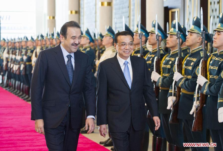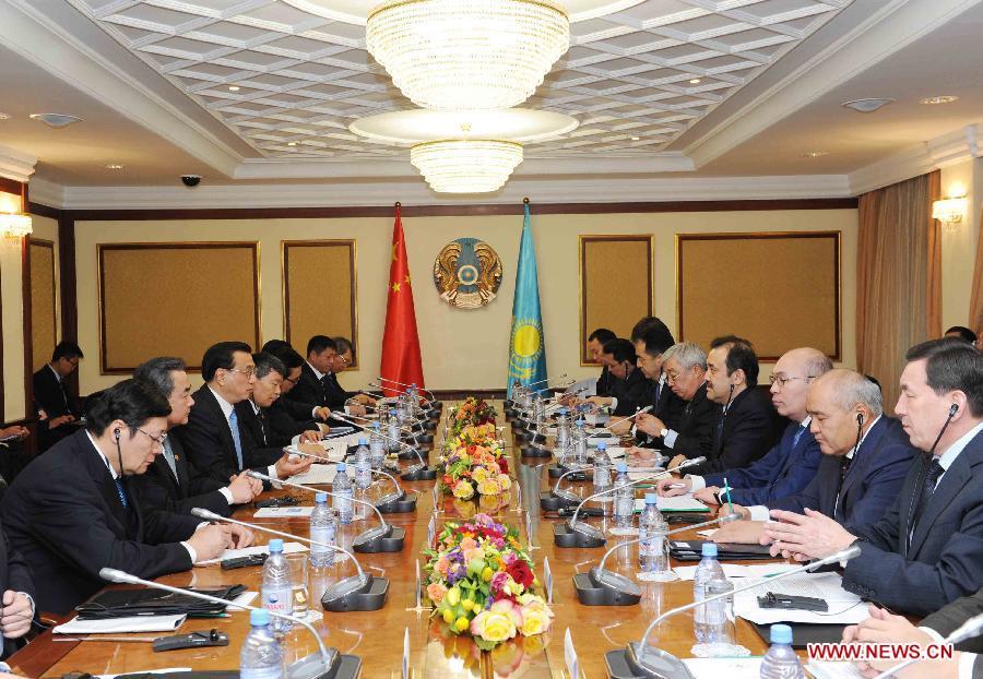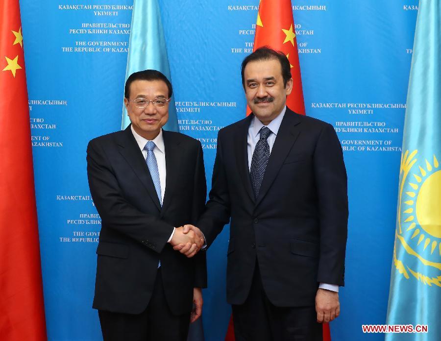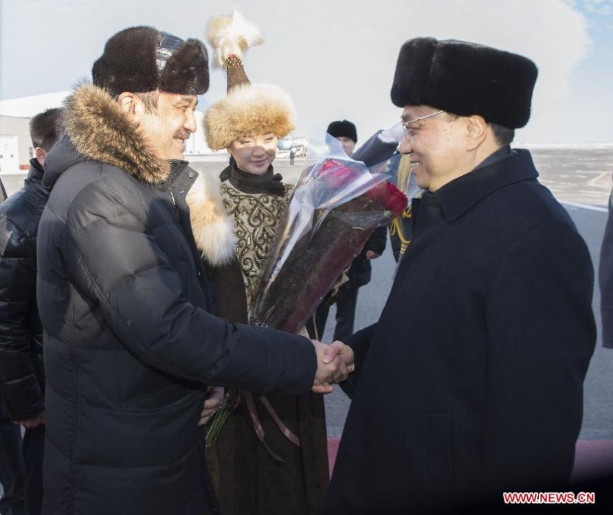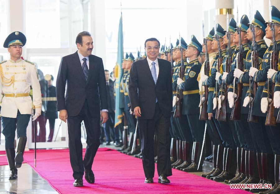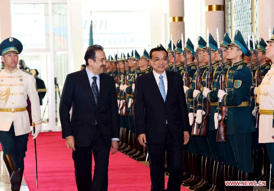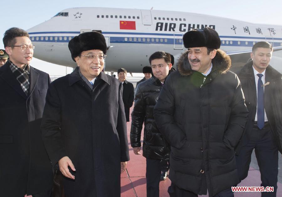 Chinese Premier Li Keqiang waves upon his arrival at Astana International Airport in Astana, Kazakhstan, Dec 14, 2014. Li arrived here Sunday to pay an official visit to Kazakhstan and attend the 13th prime ministers' meeting of the Shanghai Cooperation Organization (SCO). During his visit, Li will also hold the second regular meeting between the China-Kazakhstan heads of government with his Kazakh counterpart Karim Masimov. (Xinhua/Rao Aimin)
